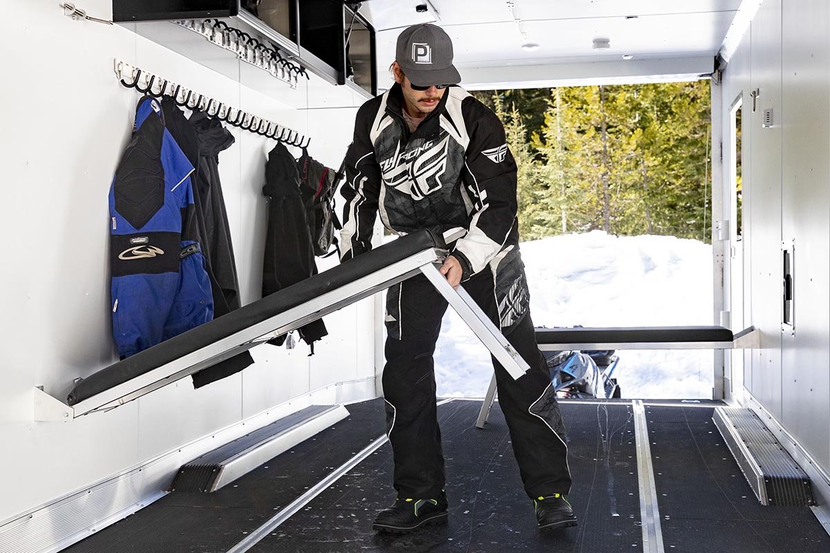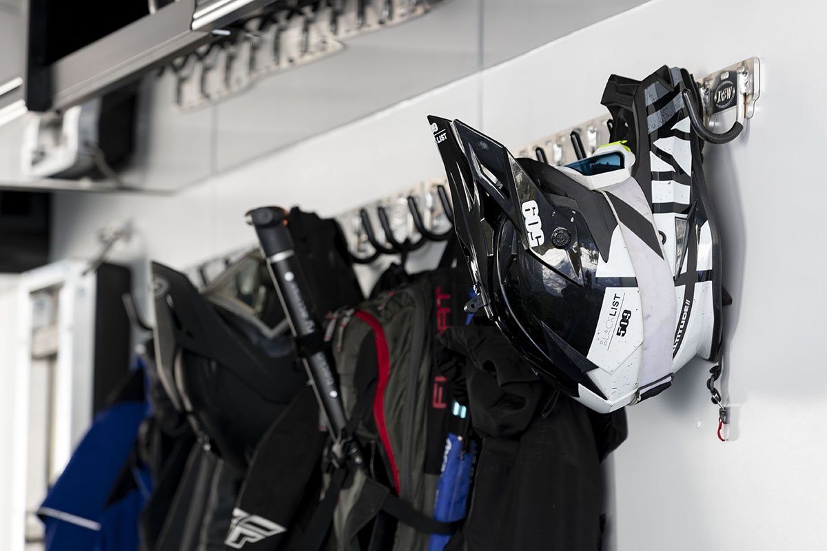 Easily hang and organize your riding gear and outerwear; the 22-slot coat hanger is mounted in the center of the trailer's ceiling.