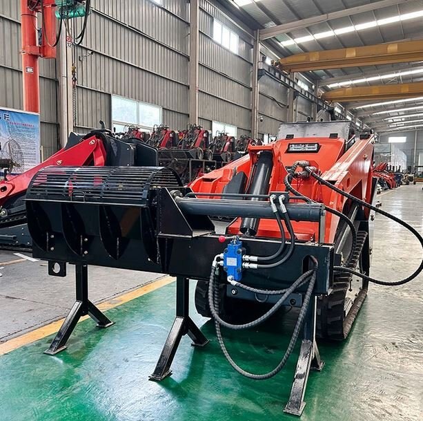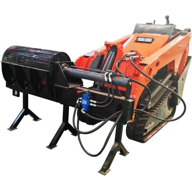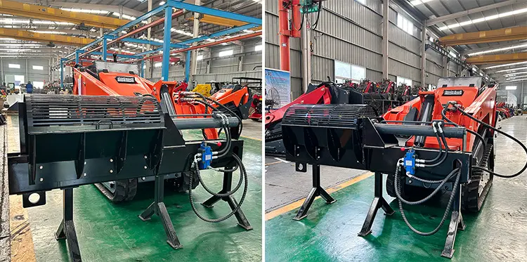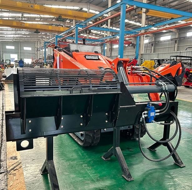 Derette V1000 mini skid steer loader with Log SplitterThe Log Splitter is a tool used to split logs into smaller pieces of wood, typically for firewood or other applications where wood needs to be split. When the Log Splitter is an attachment for a skid steer loader, it can significantly increase work efficiency because it allows the operator to process large amounts of wood without manual intervention.