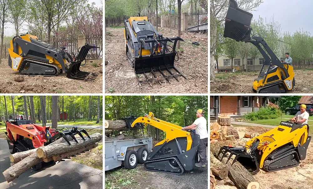 | Derette V1000 mini skid steer loader is equipped with a powerful hydraulic grapple that.Stumps and logs can be easily transported to trucks or other locations, greatly improving work efficiency. | |