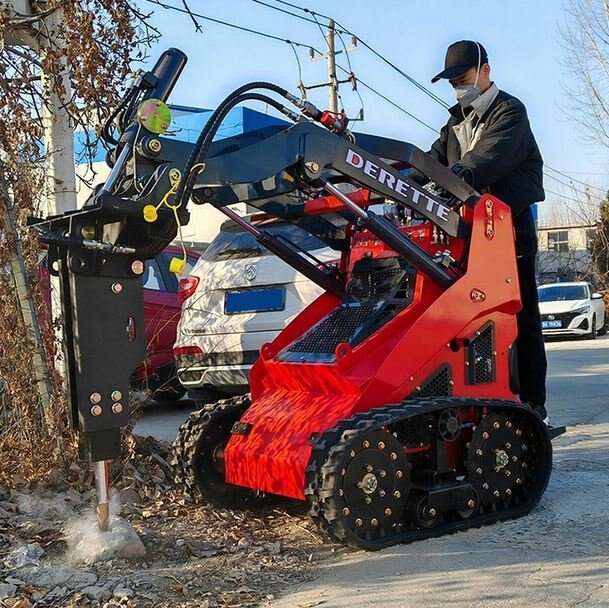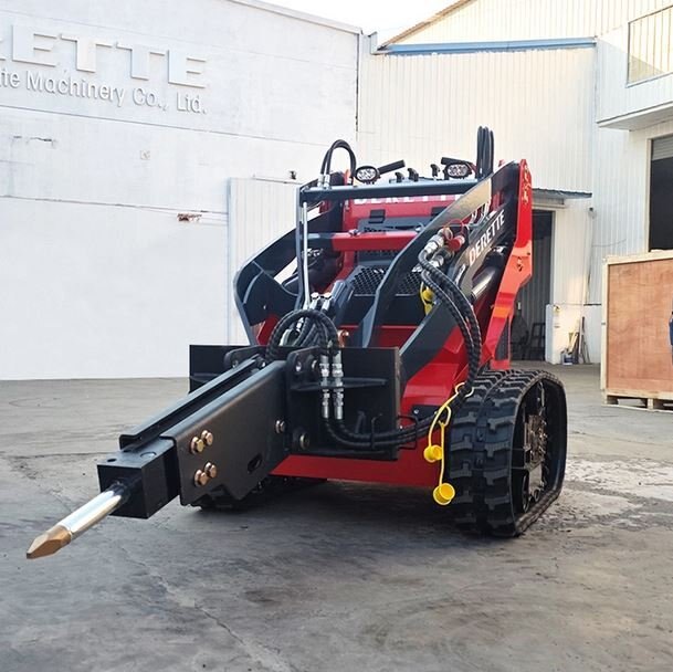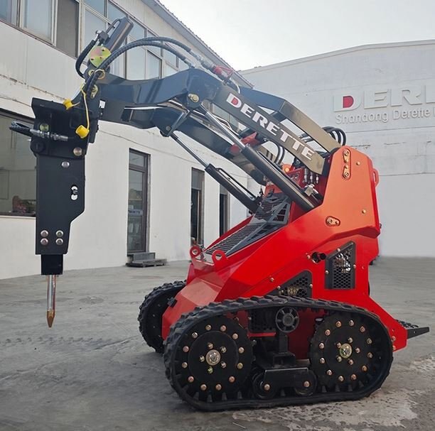 | Equipped with a hydraulic breaker attachment, the Derette Mini Skid Steer Loader 480i becomes a powerful tool specifically designed to tackle concrete breaking, hard surface excavation, and demolition work. This compact skid steer loader combines an advanced hydraulic system with a high-performance breaker, providing precise and potent demolition capabilities in tight and complex construction environments. It also supports rapid switching to other work attachments, greatly enhancing versatility and work efficiency. |
