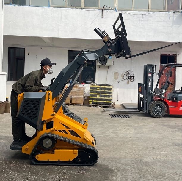 | The Derette 450T Mini Skid Steer Loader features side-shifting forks for precise material handling in tight spaces. It supports standard forks for routine tasks and offers excellent maneuverability, making it ideal for warehouses, construction sites, and landscaping. With versatile attachment options, the 450T ensures efficient and flexible performance in various environments. |
