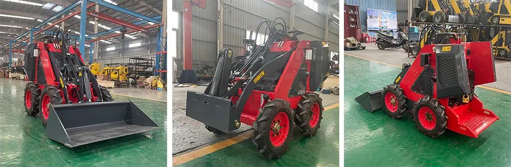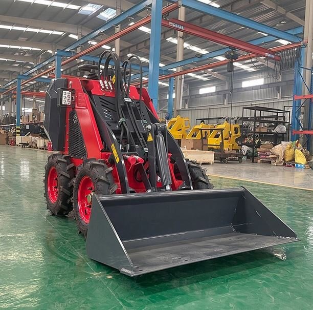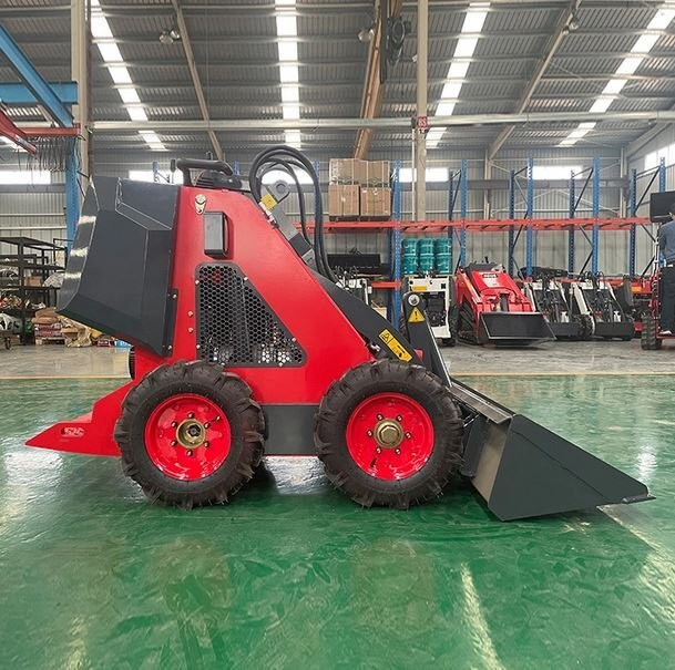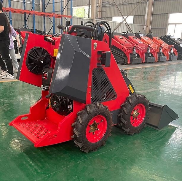 This is a very cost-effective mini skid steer loader developed and produced by our company. This loader uses narrow tires with a width of 830mm to work into the elevator so that it can work indoors. Advantages 1.Briggs Stratton EPA 13.5HP engine 2.Automatic Bucket Leveling 3.Operating weight 840 kg, lightweight and flexible 4.2 pumps & 2 valves 5.Thin wheel version has a total width of 830mm |
