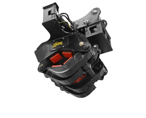 Ideal for utility applications, the AMI Pole Positioning Grapple is designed to clamp and pick up a variety of pole sizes horizontally on the ground, rotate them vertically, and position them easily and precisely into their holes. This excavator attachment features a rotating cylinder, 110 degrees of rotation, and incorporates wear pads on the arms to protect the poles from damage.