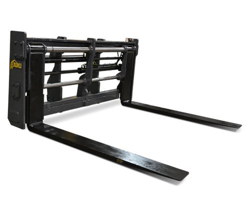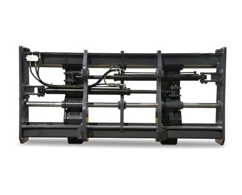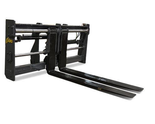 Hydraulically powered forks allow for quick adjustability of fork spacing, all from the seat of the cab.