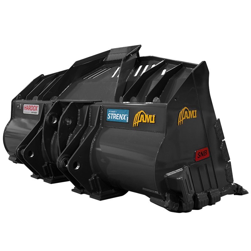 Make your point with the AMI Spade Nose Rock Bucket for Extreme Service. Built for handling rock in mining and quarry applications, the AMI Spade Nose Rock Bucket loads easily with minimal wear. Reinforced plating on the bottom and Hardox wear plate all around make this bucket rock solid.