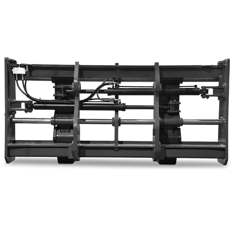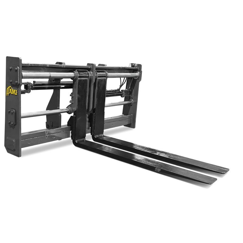 Hydraulically powered forks allow for quick adjustability of fork spacing, all from the seat of the cab.