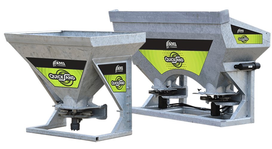 BROADCAST SPREADER Don’t let bad winter weather bring you down. Make quick work of spreading sand and salt on icy roads and walkways with the AMI QuickSand. For your Wheel Loader or Loader Backhoe, this versatile broadcast spreader is available in single and double spinner models. Made from galvanized steel, the QuickSand features hydraulic spinners and a floating agitator that prevents clumping and ensures an even distribution pattern.