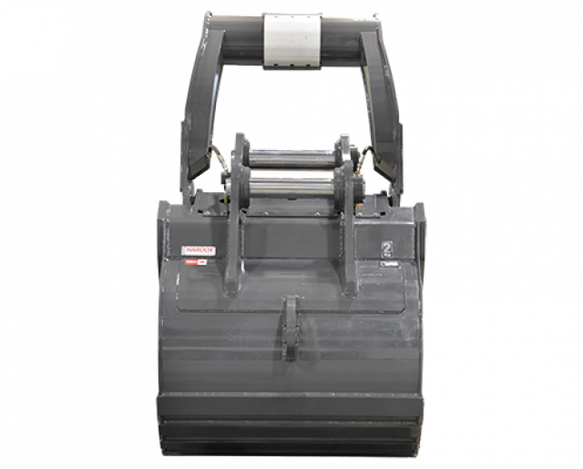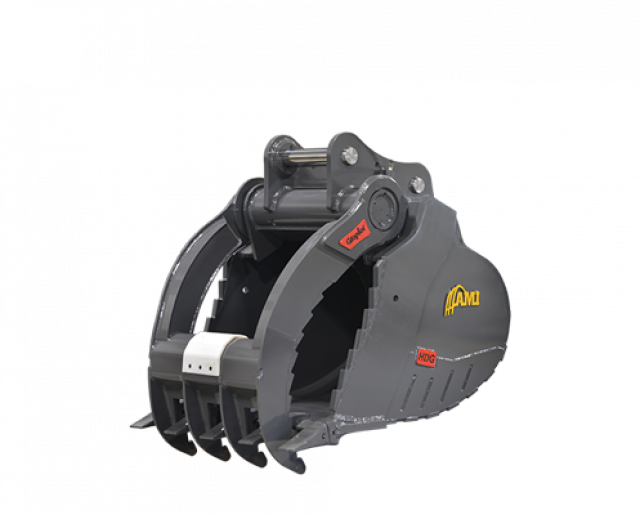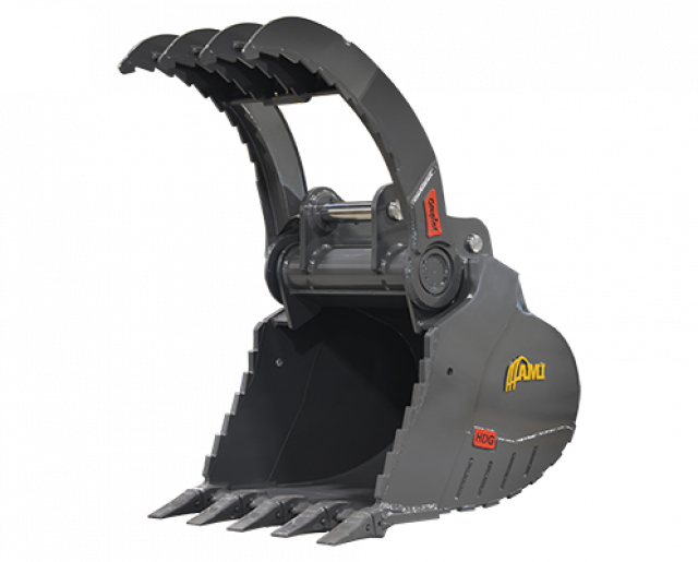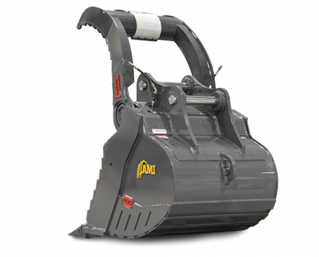 AMI's Graptor is an integrated thumb bucket. With a built in rotary actuated thumb, the operator can do a full bucket rotation without losing grip of the load.