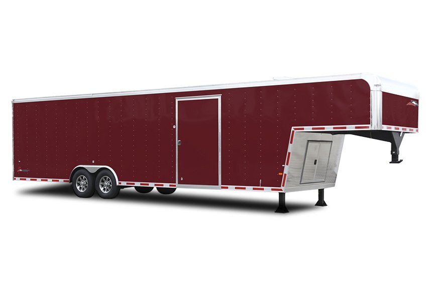 The Silver Hawk is our top of the line Gooseneck Race trailer. The bold stainless front corner wraps, coupled with the polished cast corners and stainless top wrap give this trailer a bold eye-catching look for the race tracks or highway.