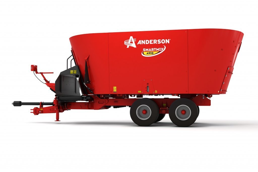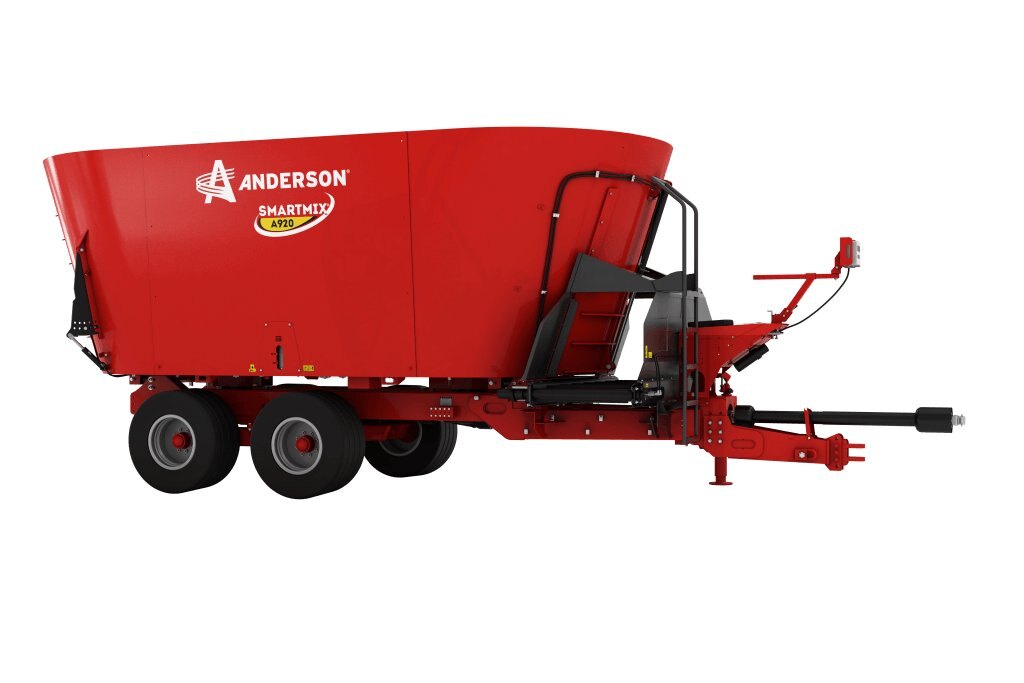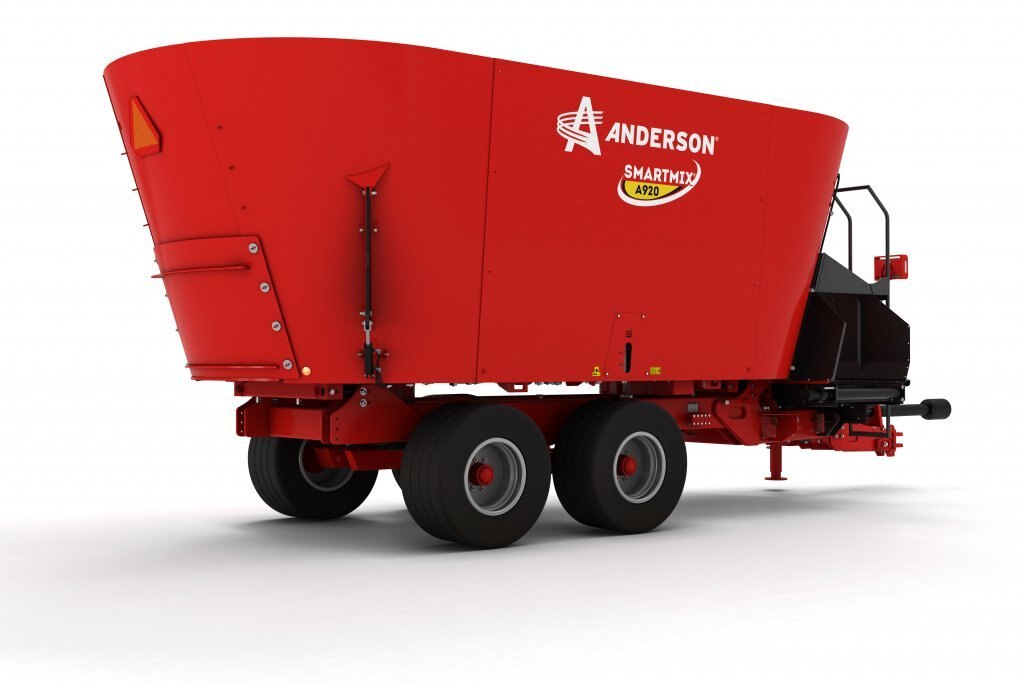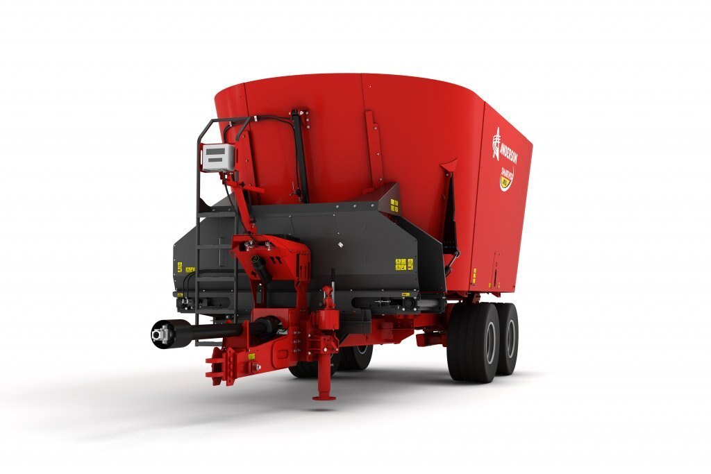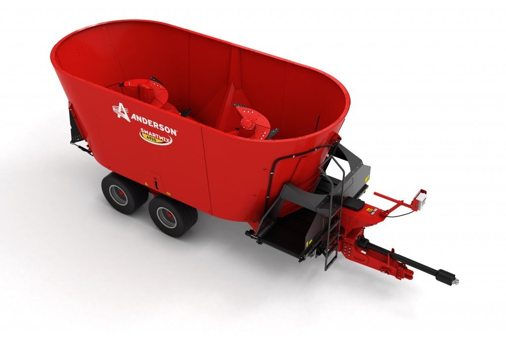Twin auger vertical TMR mixer. Capacity 920 ft3 (26.1 m3) to 1172 ft3 (33.2 m3). Height of 122 in (3.1 m) to 140 in (3.56 m) with extension. 2 augers with 8 reversible knives each in carbide tungsten (12 knives per auger, optional)