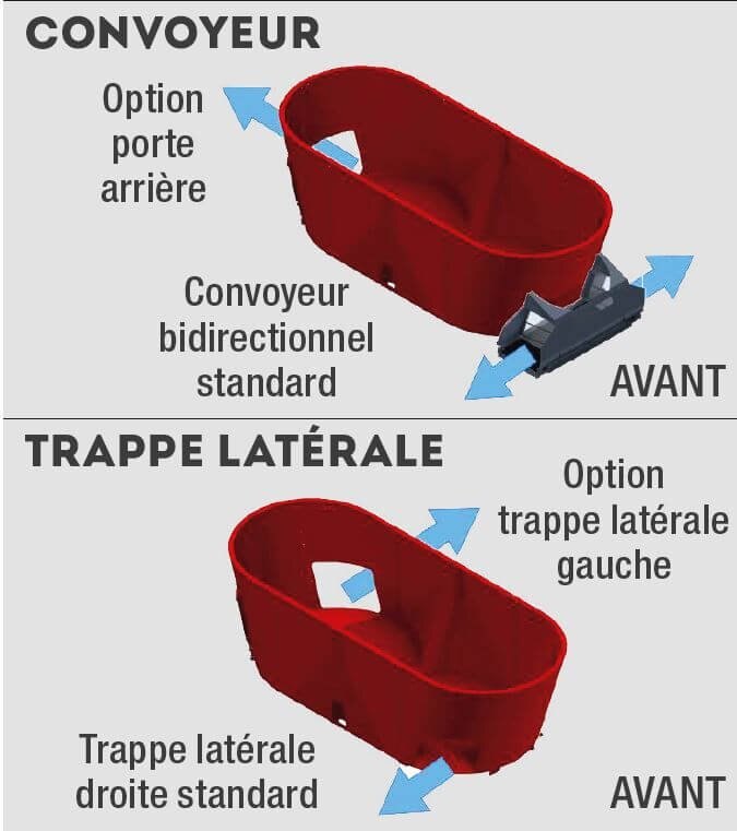 TRI-CUT™, auger with 2-position adjustable and reversible knives (10 standard) and 2 sweeping dispensers ensuring a 30% faster and more consistent discharge.