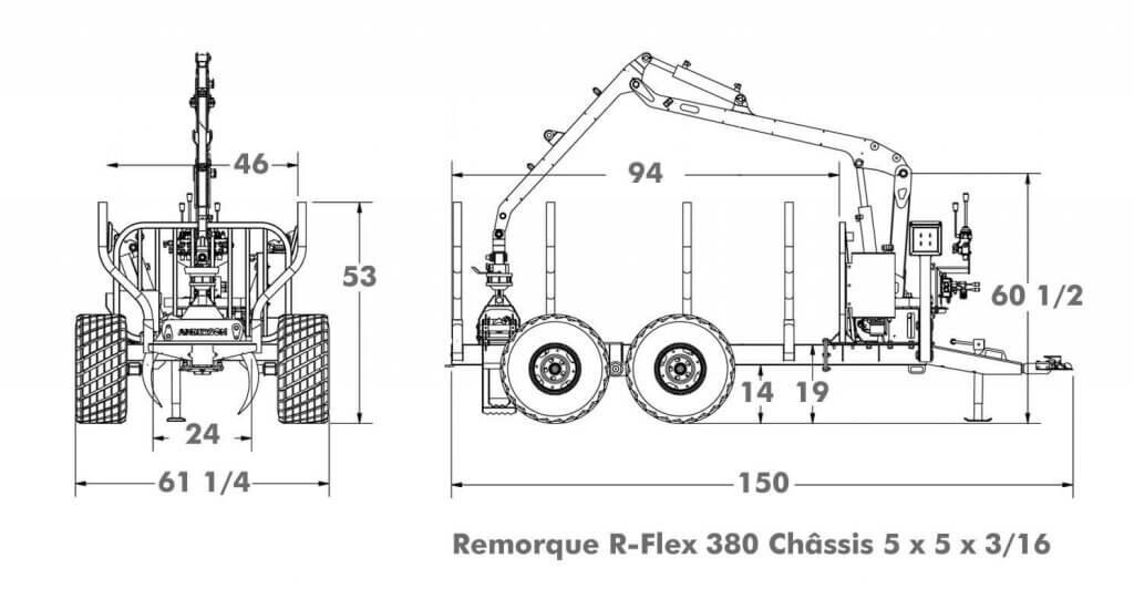 The M-90 log loader offers performances that exceeds, by far, its simple dimensions. This equipment is easily maneuverable with its hydraulic adjustable tandem axle that allows to balance loads and maximize capacity, even on rough terrain. Ideal with ATV, truck or tractor.