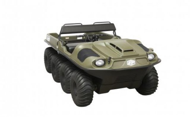 This 8-wheel drive amphibious off-road vehicle is powered by a 4 stroke OHV V-Twin air cooled 747cc, 23 hp (17 kW) Kohler Command Pro engine with electronic fuel injection. It has a load capacity of up to 1000 lb. / 454 kg on land or 900 lb. / 408 kg on water, can transport 6 passengers on land, 4 on water and features a towing capacity of 1,400 lb. / 635 kg