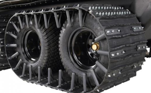 Heavy Duty Extreme Terrain solid rubber hinged tracks, with 4 segments, HD steel guides, HD hinges and reinforced steel rims. Fits over 2 tires, resulting in a 4-track configuration.