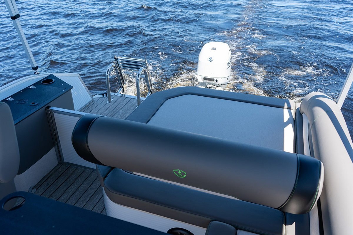 • Large rear bench with "Swing back" backrest that tilts to face forward or backward on the pontoon
