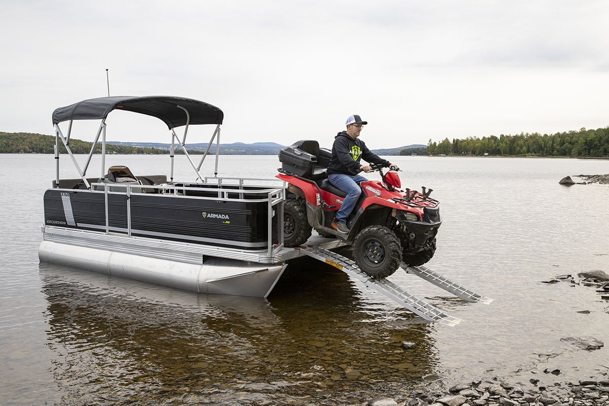 The Excursion is our transport pontoon that will assist you with your toughest jobs. It offers a large loading capacity and plenty of space. Just picture it with your ATV and building supplies!