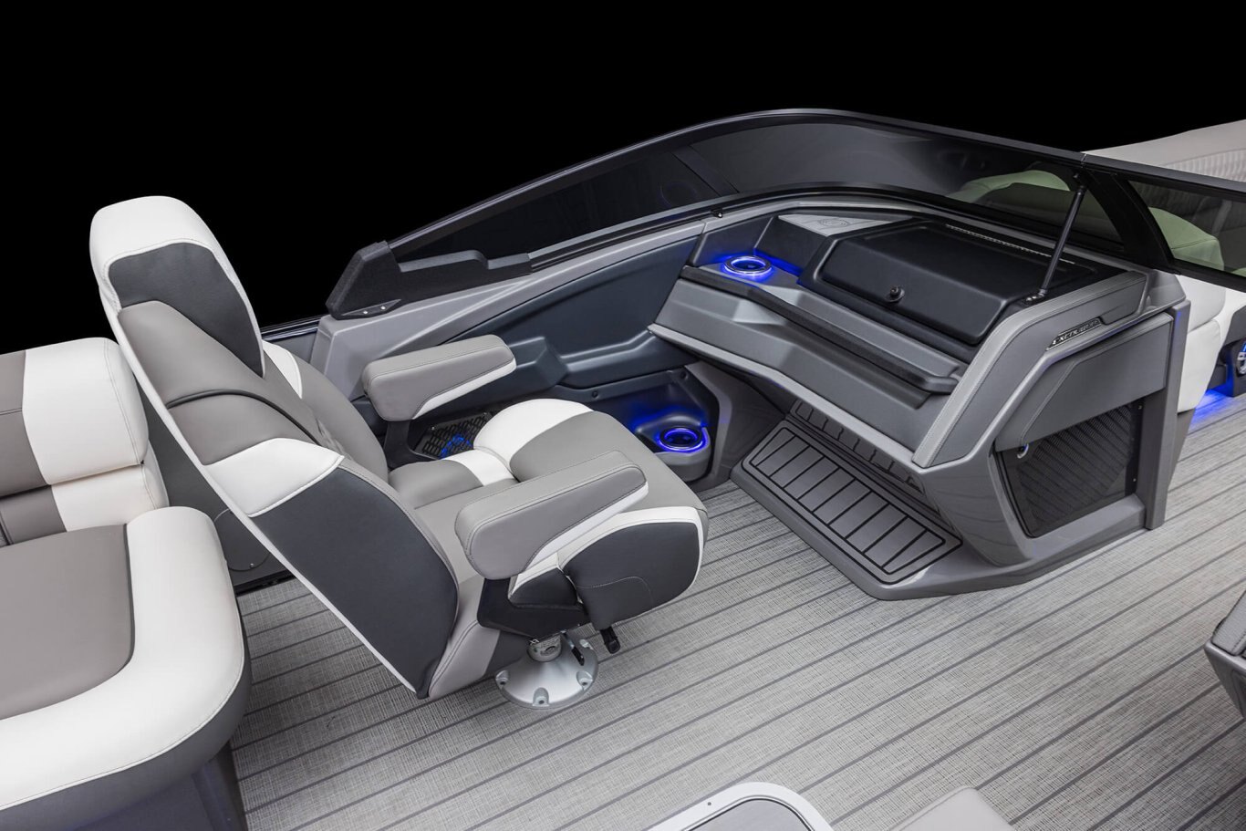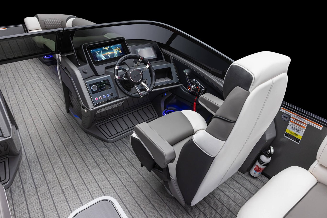 Dual Commander III fiberglass helmstands with full windshield, Simrad NSX9 & NSX7 multi-function touchscreen digital dash panel, USB charging ports & light controls