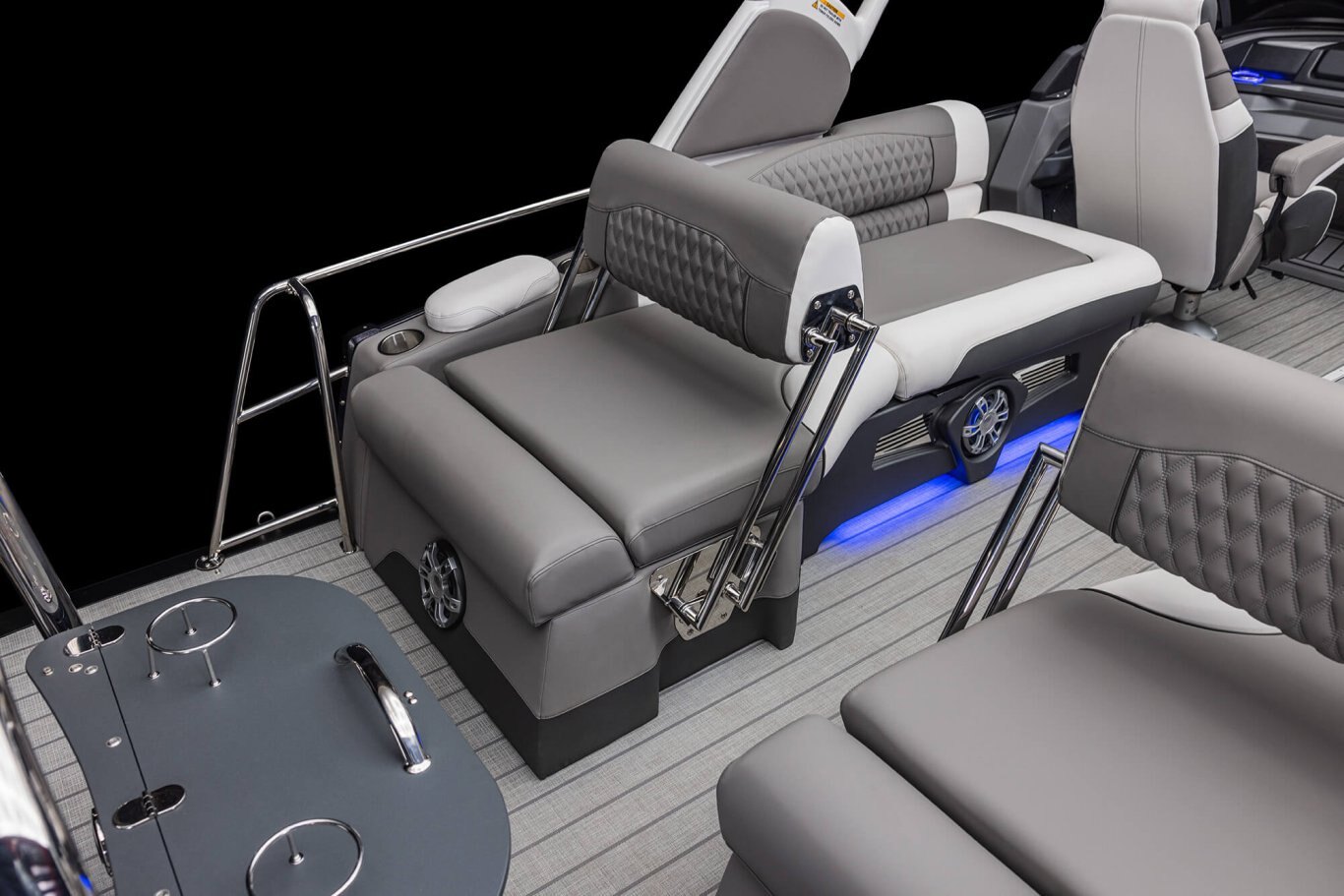 High performance sound package: Fusion RA-670 radio, (6) Fusion XS lighted speakers & grills, Fusion 6-channel amp, Fusion D mono block digital amp, 10” Fusion Subwoofer, USB audio input & charge
