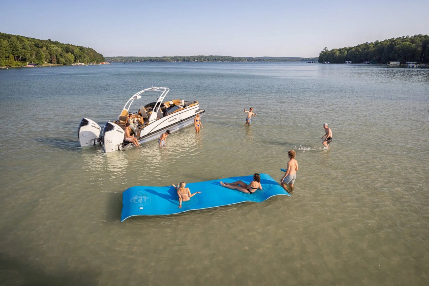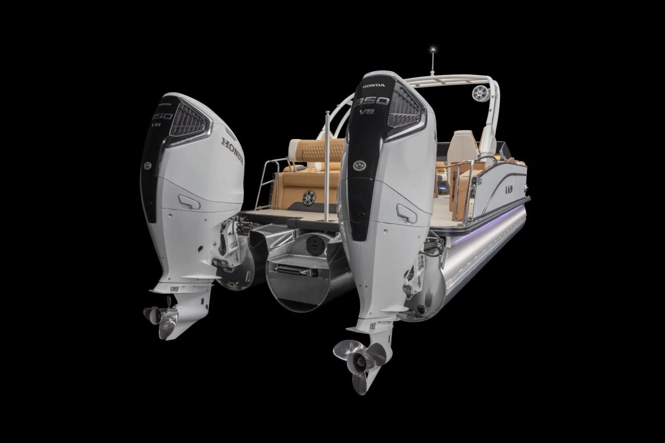 (2) 25” diameter pontoons (2) 27” diameter pontoons with lifting fins (CRFS, ENTFS) Waveglider triple 25” pontoons w/high performance lifting fins, ski tow bar & aluminum waveshield (CRBW, ELW, QLSW & QLW) 3” rub rail with black vinyl insert Deck corner impact protection – polished aluminum Tapered front deck Extended rear deck Pontoon double full risers (4) stainless U-bolt & cleat combo 25” transom (CRFS, ENTFS)