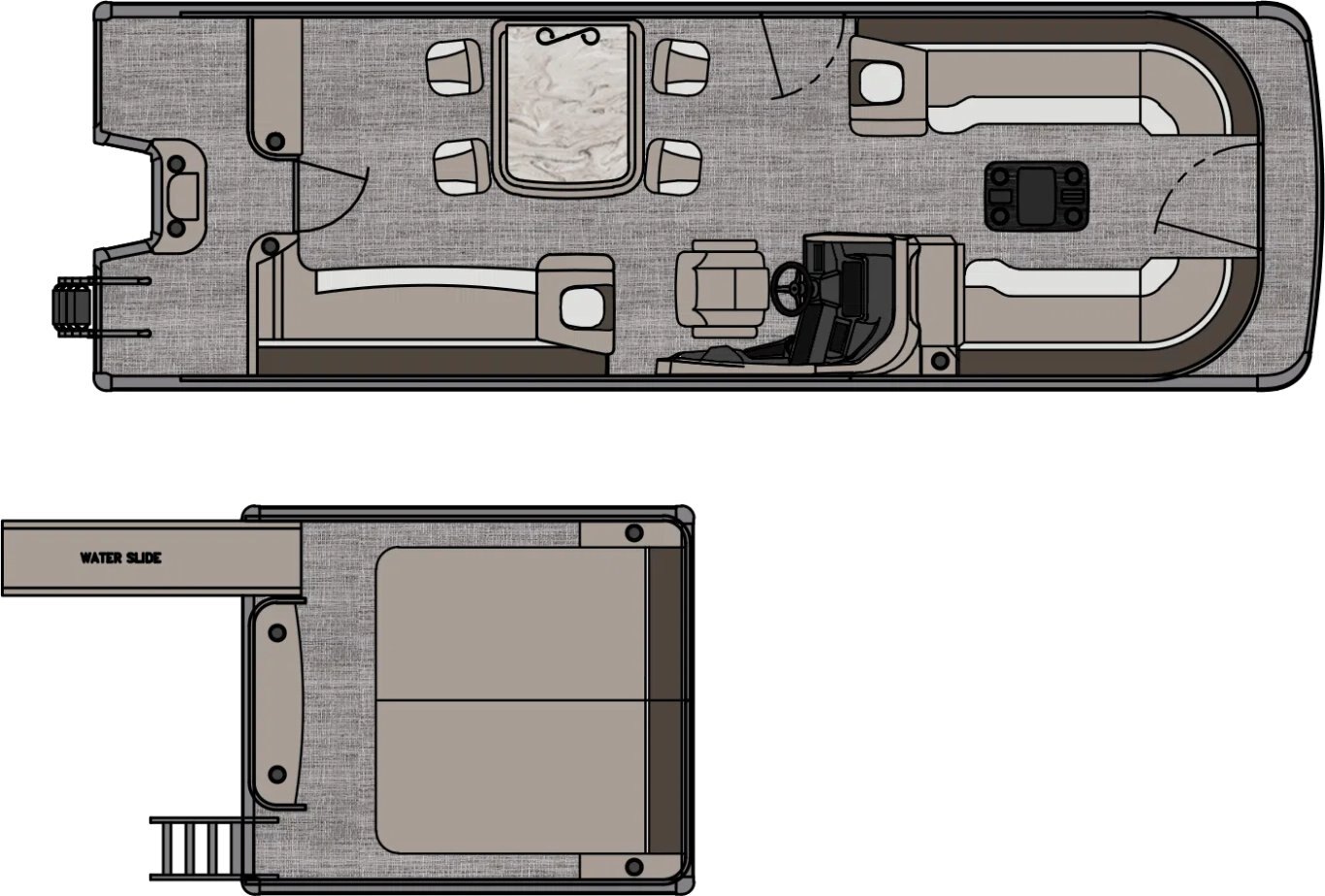 Commander’s mid back reclining driver’s chair with color-matched accents Admiral high back reclining driver’s chair with flip-up bolster & color-matched accents(CRBW, ELW, QLSW, QLW) Chair adjustment slider, front, back, rotate 4000 Series furniture with Leon seat vinyl & heat stamp accents Suspension seating Upper deck furniture – includes backs, arms, sun pads, rear console with 2 speakers on the upper deck (CRFS, ENTFS) Lounge arms with storage (based on floorplans) Privacy station curtain & frame (N/A on CRBW, QLSW & QLW) Interior composite wall panels (except RF) Deluxe seat frame cladding Lifetime aluminum seat frames with flow-through ventilation Full Riptide vinyl flooring 2 moveable cupholders Stainless steel cup holders Greywood heavy duty thermoform table with large cup holders, recessed tray & phone storage (large kidney or rectangle) USB charging port Vinyl non-skid strips for entry gates Battery Selector Switch Manual – on/off/1/2/both (ELW, QLSW, QLW) Battery dual smart switch system (CRFS, ENTFS)