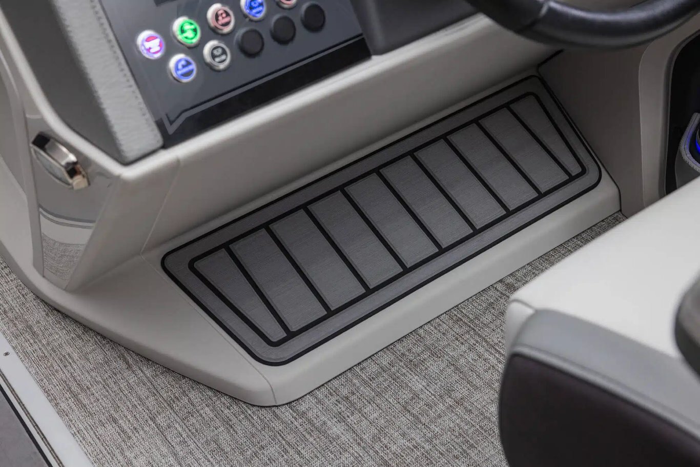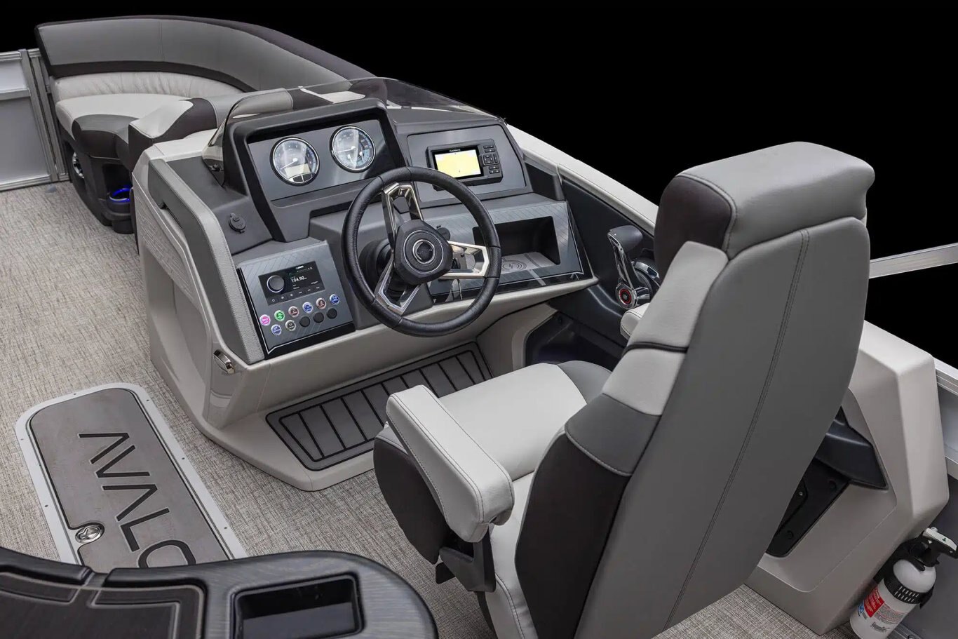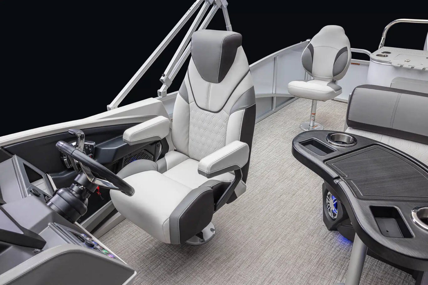 Ensign III rotocast helmstand with analog dash panel Dual Commander III fiberglass helmstands with full windshield & analog dash panel (CRBW, ELW, QLSW, QLW) Tach, Volt, Fuel Gauges GPS speedometer 12-Volt power point Gold Plus sound package: Fusion RA-670 radio, (6) Fusion XS speakers & grills, Fusion 6-channel amp, USB audio input & charge Mechanical tilt steering BayStar hydraulic tilt steering (CRFS & ENTFS) SeaStar hydraulic tilt steering (CRBW, ELW, QLSW & QLW) Huron steering wheel Removeable windshield Courtesy light on helmstand