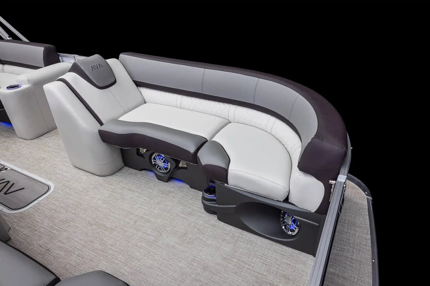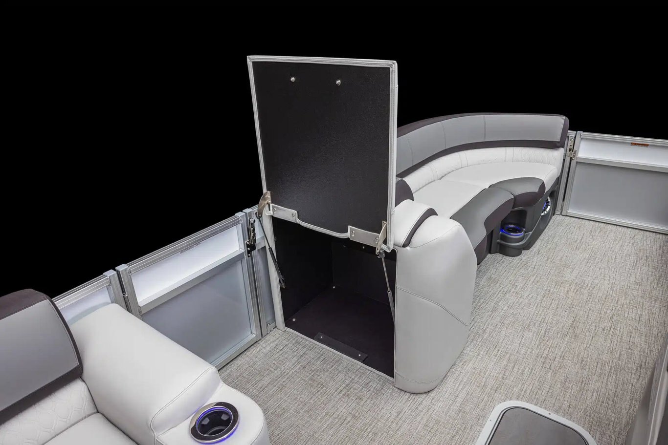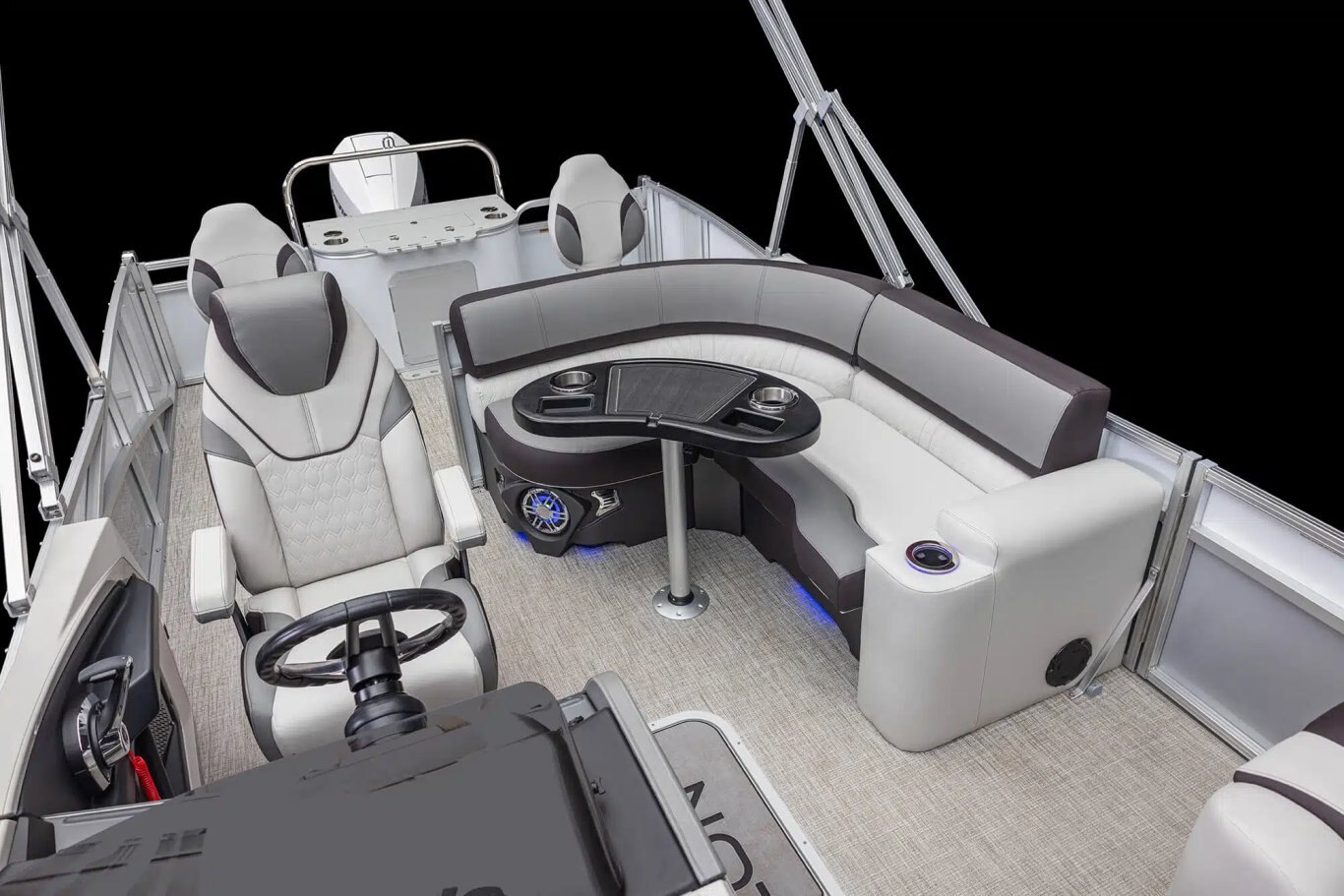 Commander’s mid back reclining driver’s chair with color-matched accents Admiral high back reclining driver’s chair with flip-up bolster & color-matched accents(CRBW, ELW, QLSW, QLW) Chair adjustment slider, front, back, rotate 4000 Series furniture with Leon seat vinyl & heat stamp accents Suspension seating Upper deck furniture – includes backs, arms, sun pads, rear console with 2 speakers on the upper deck (CRFS, ENTFS) Lounge arms with storage (based on floorplans) Privacy station curtain & frame (N/A on CRBW, QLSW & QLW) Interior composite wall panels (except RF) Deluxe seat frame cladding Lifetime aluminum seat frames with flow-through ventilation Full Riptide vinyl flooring 2 moveable cupholders Stainless steel cup holders Greywood heavy duty thermoform table with large cup holders, recessed tray & phone storage (large kidney or rectangle) USB charging port Vinyl non-skid strips for entry gates Battery Selector Switch Manual – on/off/1/2/both (ELW, QLSW, QLW) Battery dual smart switch system (CRFS, ENTFS)