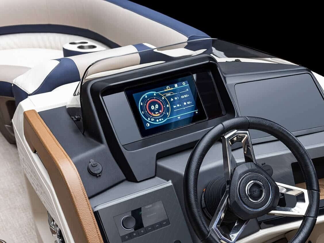 Ensign III rotocast helmstand with analog dash panel Dual Commander III fiberglass helmstands with full windshield & analog dash panel (CRBW, ELW, QLSW, QLW) Tach, Volt, Fuel Gauges GPS speedometer 12-Volt power point Gold Plus sound package: Fusion RA-670 radio, (6) Fusion XS speakers & grills, Fusion 6-channel amp, USB audio input & charge Mechanical tilt steering BayStar hydraulic tilt steering (CRFS & ENTFS) SeaStar hydraulic tilt steering (CRBW, ELW, QLSW & QLW) Huron steering wheel Removeable windshield Courtesy light on helmstand