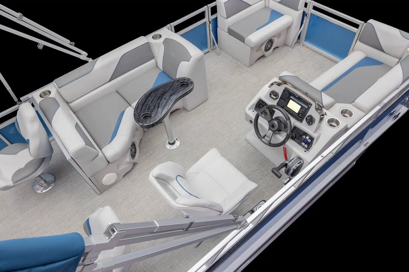 (2) 23” diameter pontoons 3” rub rail with black vinyl insert Deck corner impact protection – aluminum Tapered front deck Pontoon double full risers (4) stainless U-bolt & cleat combo
