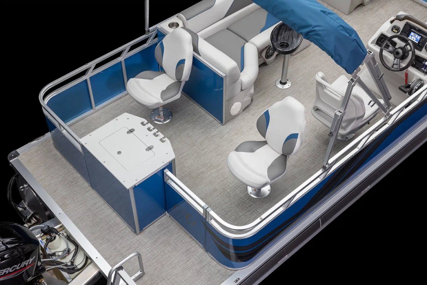 Rear fishing center with rod holders & livewell (2) fishing chairs with locking seat bases