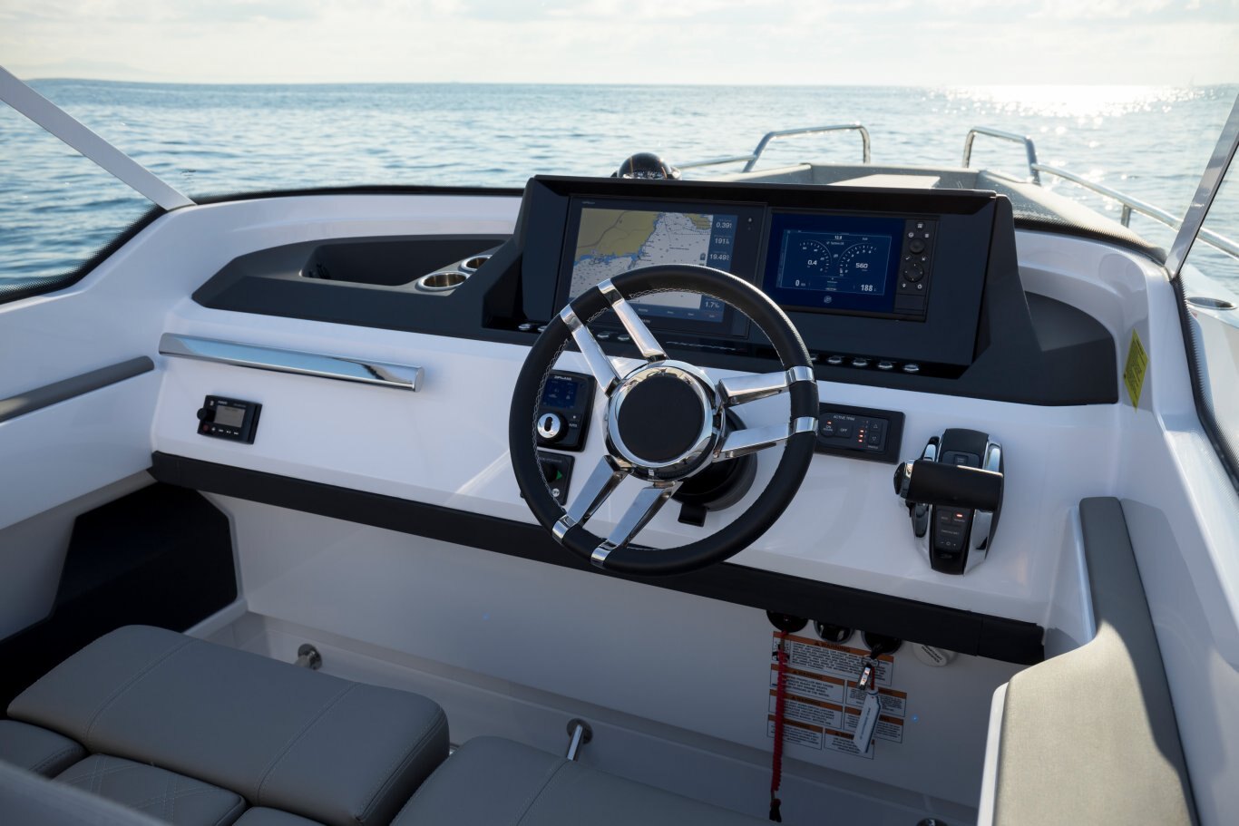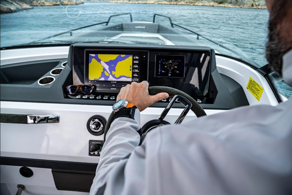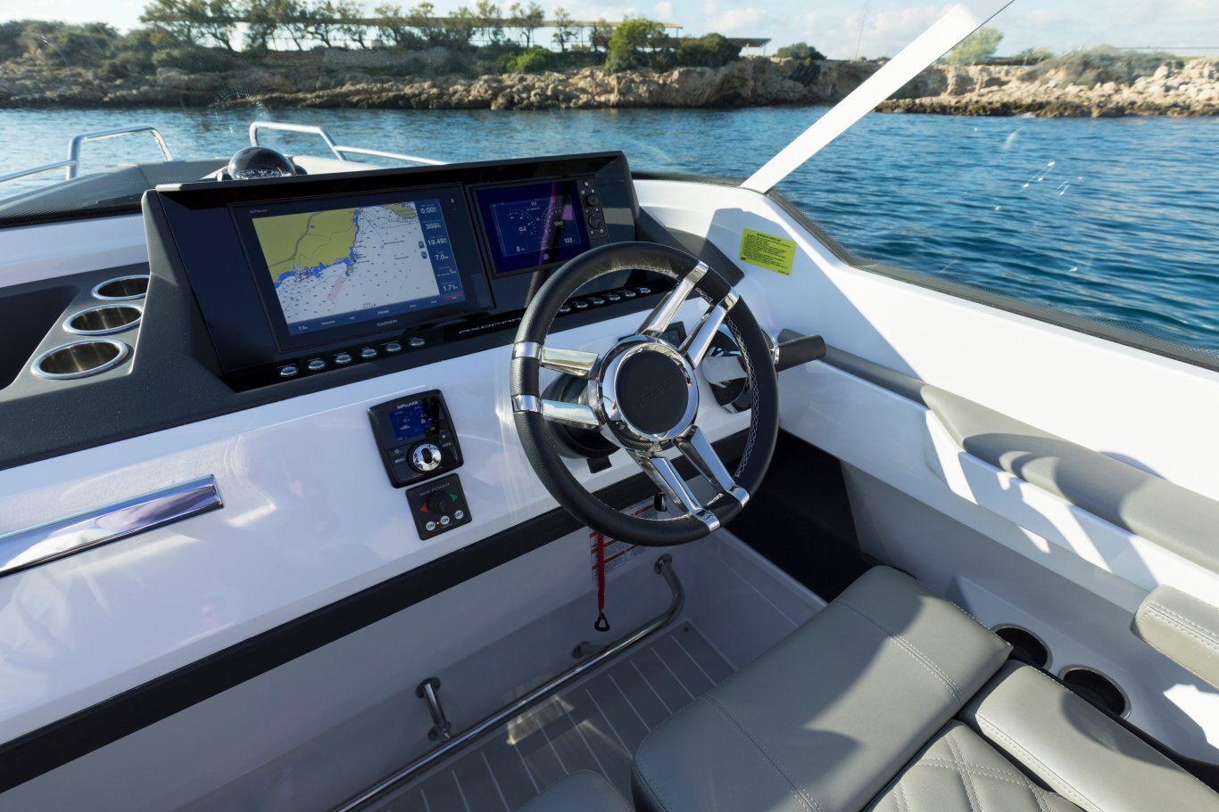 Clean Helm-layout, Dashboard & console top panels in dark grey soft touch finish, Center console panels in black high-gloss finish, Helm panel with passenger side grab rail, Control switch panel in glass w. illuminated push buttons, Steering wheel in leather w. Axopar logo, Main control panel with twin battery switches and automatic fuses for direct supply, Cupholders on dashboard x2, 12V power outlet on dashboard. |