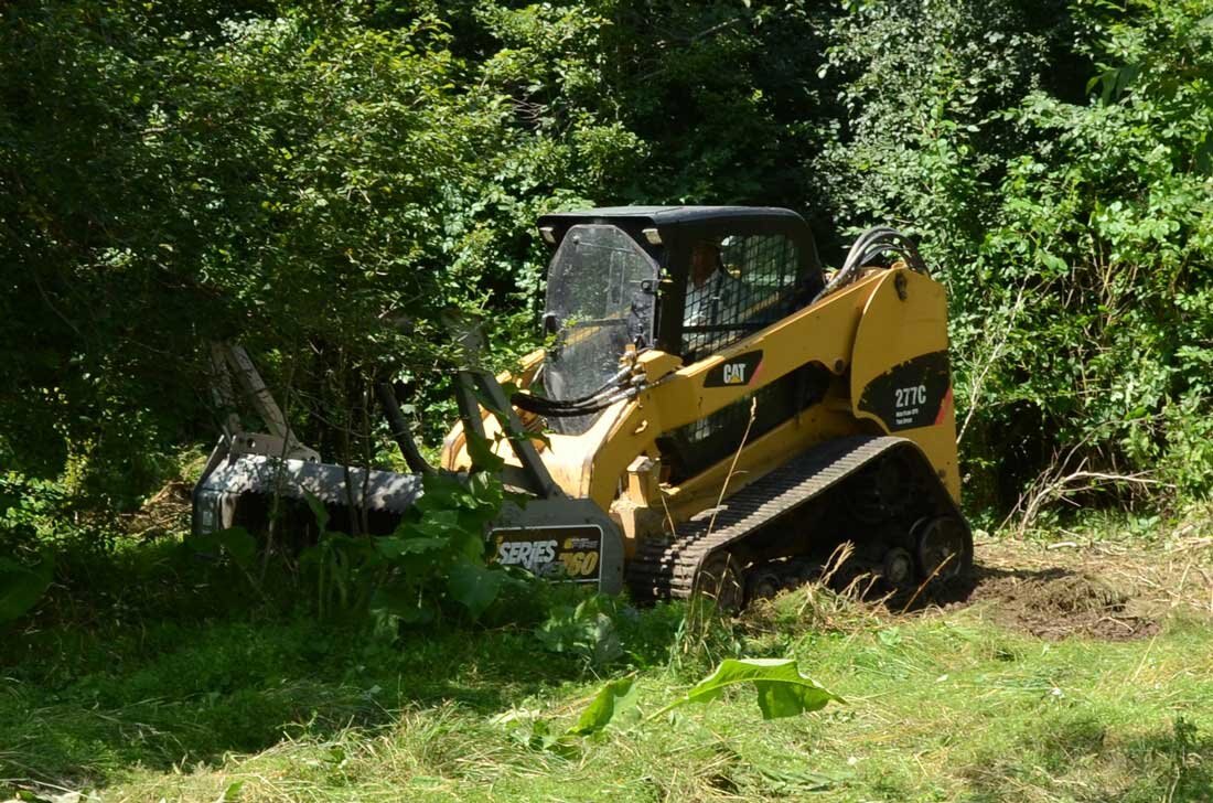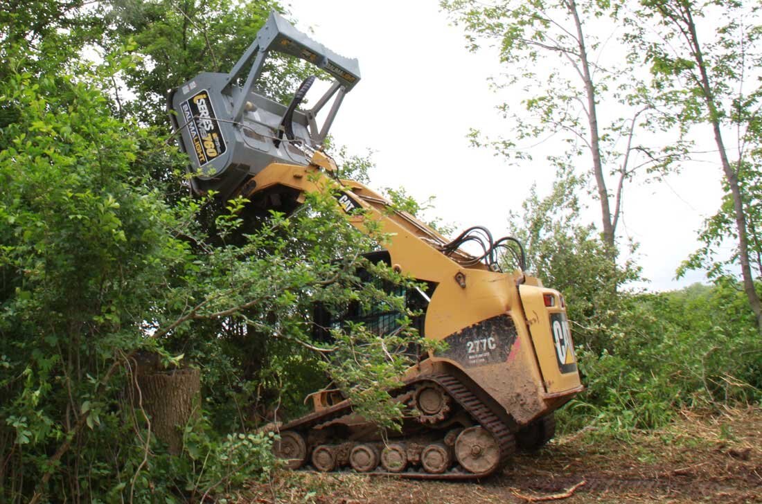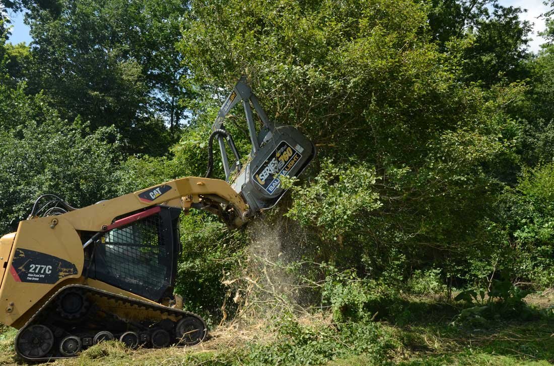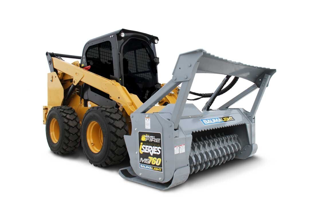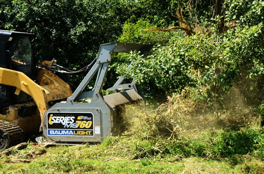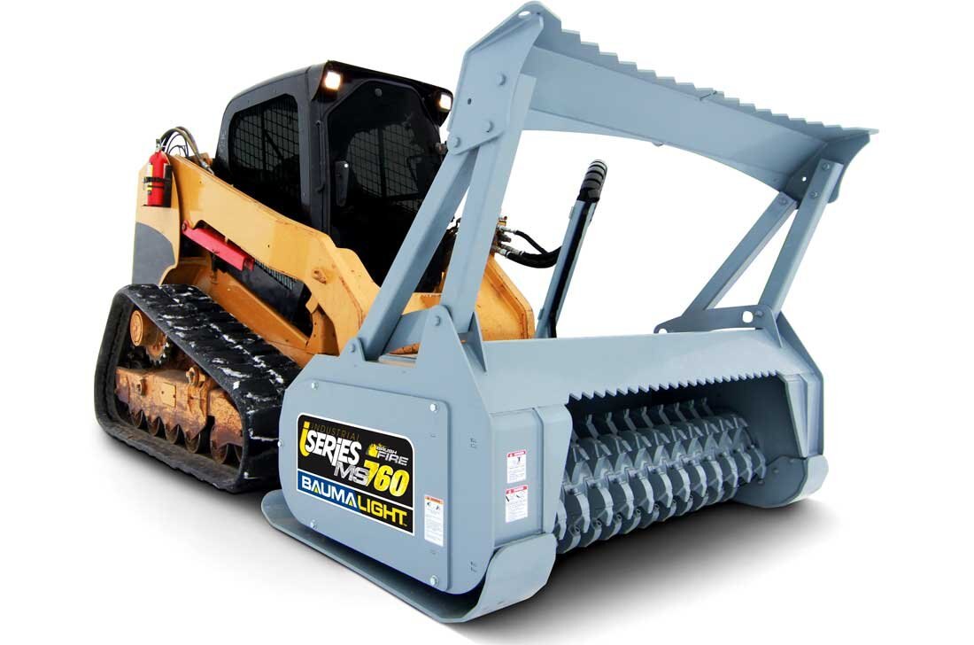 The 700 series Baumalight Brush Fire brush mulchers will efficiently mulch heavy brush and trees and are designed for contractors, rental and any other heavy duty mulching and land clearing. The 700 Series teeth are available in either Ripper or Planer style. The carbide Ripper tooth is the good general use tooth. Their v-shaped design shreds through brush unforgivingly and makes them less vulnerable in areas plagued by rocks and debris. The 700 Series Planer style tooth provides the most efficient cutting by smoothly chipping away at the brush. Its flat profile however makes it vulnerable to shattering on impact with rocks and other debris. The 500 & 700 series skidsteer mulchers come with pressure gauges which is very handy to watch and see how close you are to maximum pressure; once you start blowing over relief the mulcher becomes very unproductive. Operating a Brush Mulcher from a skid steer is probably the most comfortable way for vegetation management as your work is directly in front of you and new skidsteers are very operator comfort focused. See our brush cutting size chart to see what limb size this excavator mounted forestry mulcher can handle.