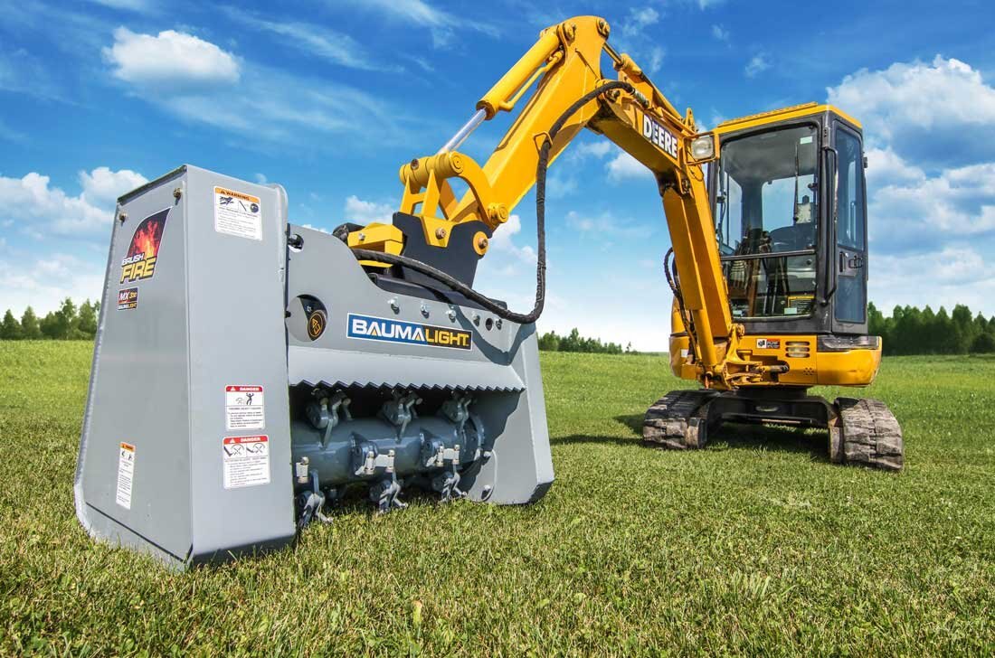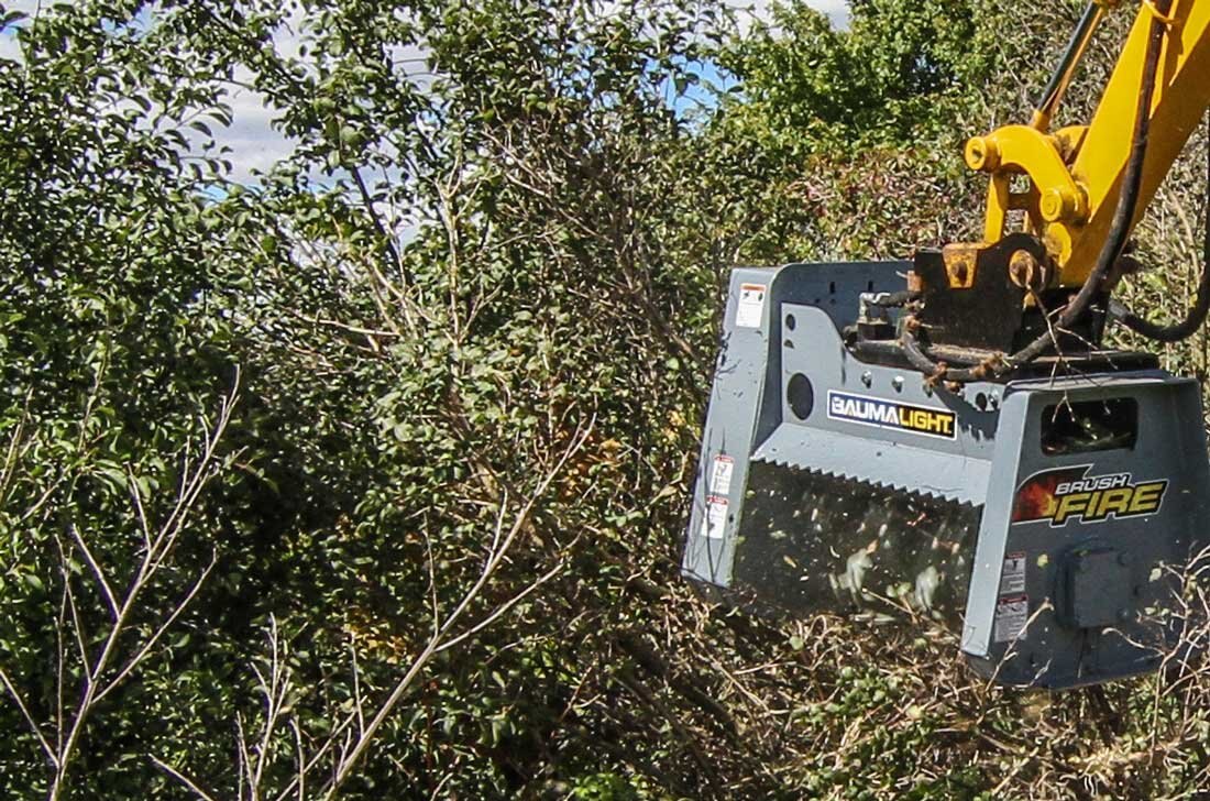Our most light weight fixed tooth brush mulcher for excavators, with adequate flow, the MX330 Brush Fire brush mulcher will efficiently cut heavy vegetation and light brush using Green Teeth. The concave shaped carbide tip provides aggressive brush mulching action by chipping the brush bit by bit. Part of the secret of their performance is the ease of rotating the teeth so there is always a sharp edge to make mulching easier. See our brush cutting size chart to see how much this light weight excavator mounted forestry mulcher can tear up. With the built in control and precision of the excavator, mulching around objects is not a problem, whether it’s in a ditch or overhead. |