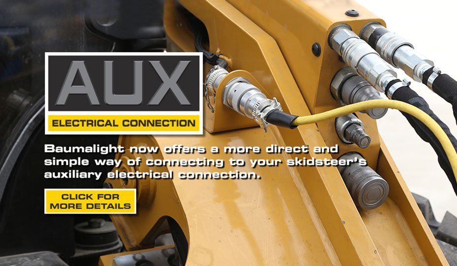AUX Plug Baumalight now offers a more direct and simple way of connecting to your skidsteer’s auxiliary electrical connection. Simply connect the hydraulics and plug in the electrical. Now you can control the attachment from inside your cab. |