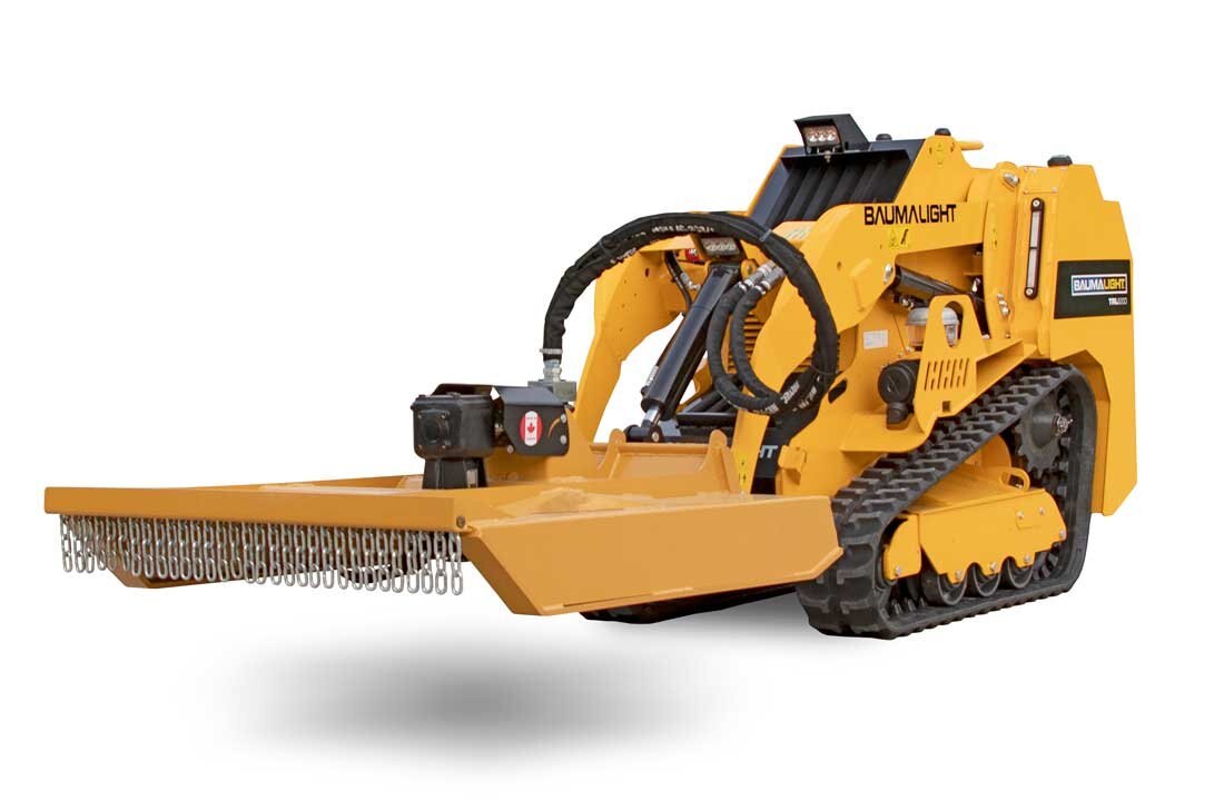 The Baumalight tracked mini skidsteer, is manufactured in Ontario Canada and powered with a Kubota diesel engine, the Baumalight Compact Utility Track Loader is designed to easily navigate through tight spaces and good productivity on the tools. The hydrostatic drive is set up with true joystick controls with hydraulic pilot lines just like large skidsteers have. The remote hydraulic pump system with case drain delivers hydraulic flow that can be set to maximum engine capacity and the standard self-levelling bucket reduces spills and provides extra control when loading and unloading material. The Baumalight all metal frame mini track loader also features durable rubber tracks that can handle uneven or rough terrain, and ride-on platform for improved visibility while manoeuvring through confined areas.