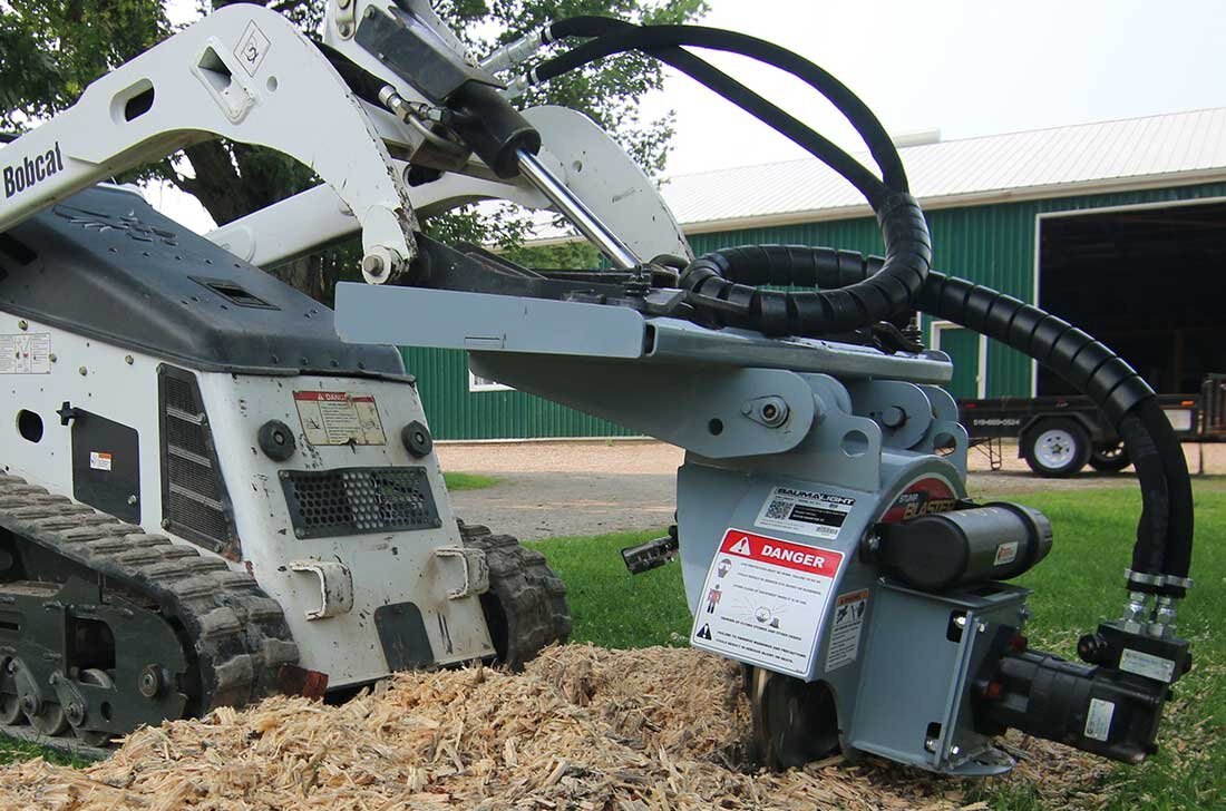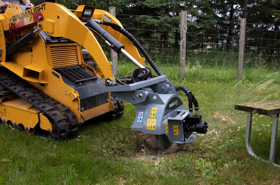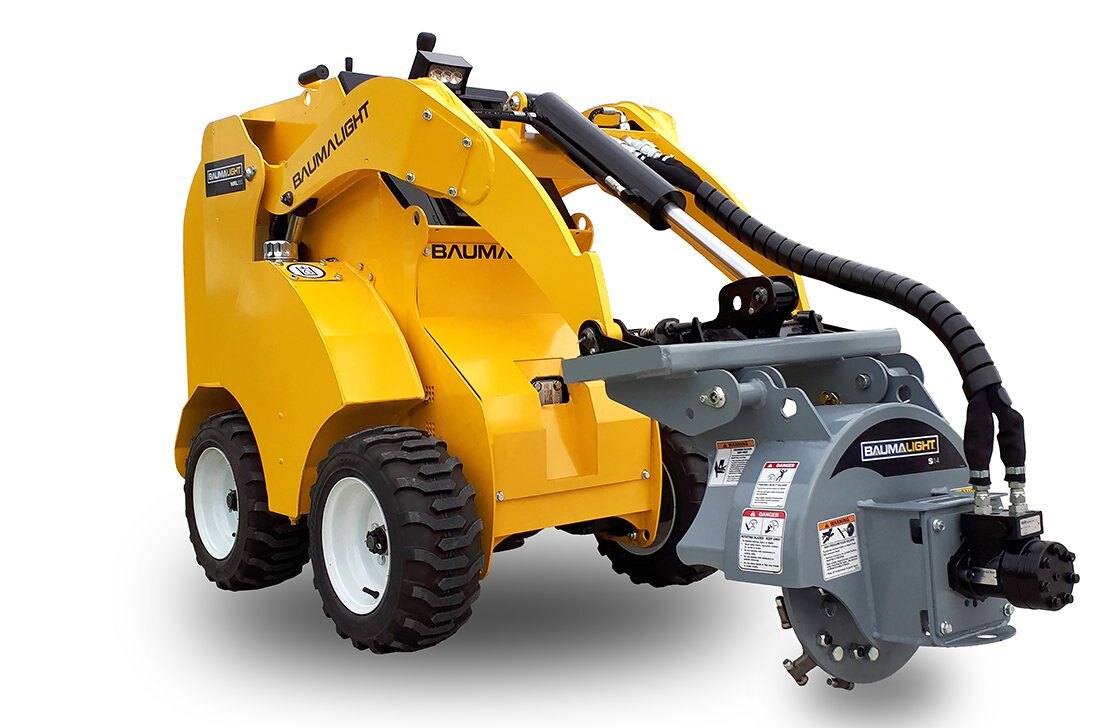 Baumalight S14 Stump Grinder in use by a customer who is renting a prototype Baumalight mini skidsteer