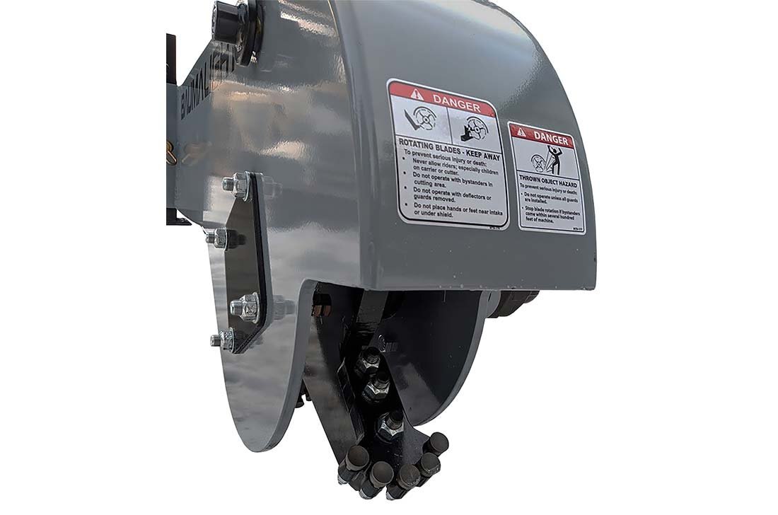 The S40 stump grinder is mounted with a bent axis piston motor. By matching a motor to your skid steers hydraulic flow these high efficiency motors make the most hydraulic power transforming it into the highest available stump grinding performance. Stocked with 20 High speed teeth the massive 1.25” thick steel rotor provides the back bone for the Skidsteer mounted stump grinder. The high number of teeth means that each tooth needs to do less work. Each tooth only needs to make a small cut, because the work is shared by more of these highspeed teeth, which last longer and typically only need 2 or 3 replaced at a time. The bolt-on designed teeth allow for straightforward replacement. The teeth can also be rotated up to 3 times to provide a renewed cutting surface even in the field.