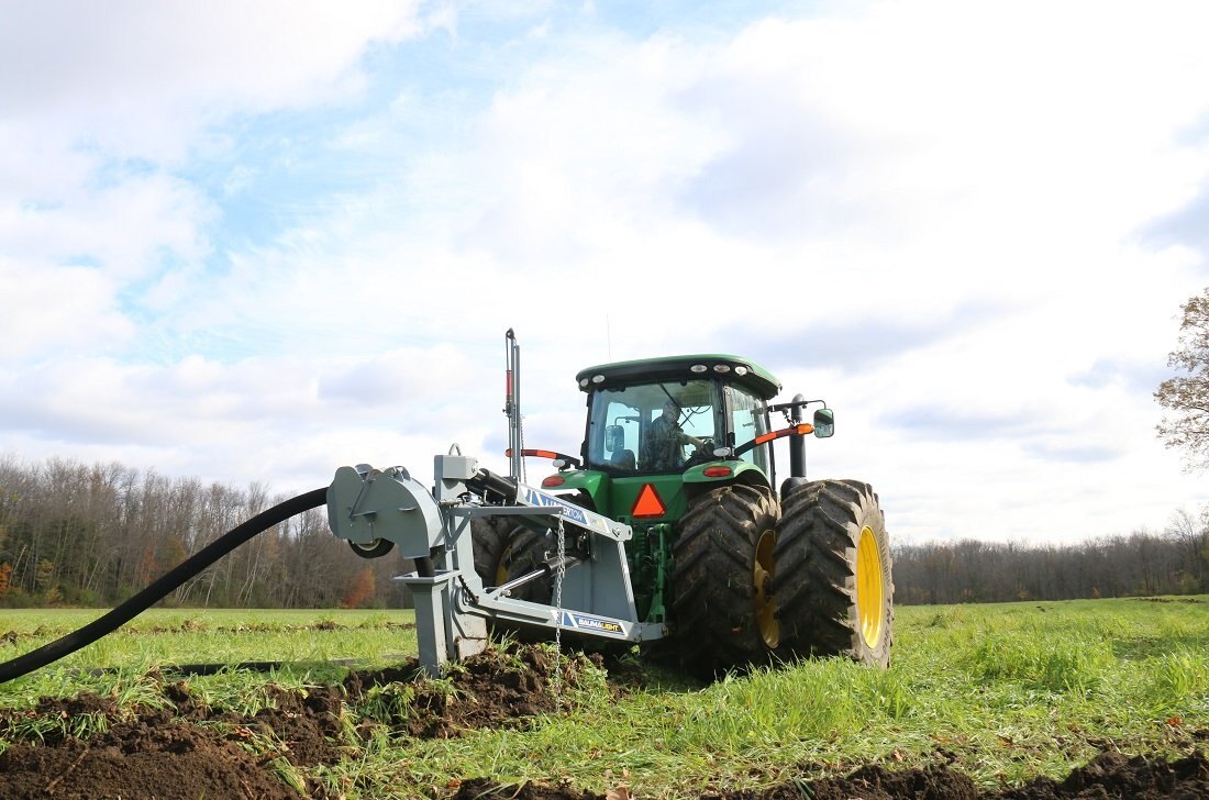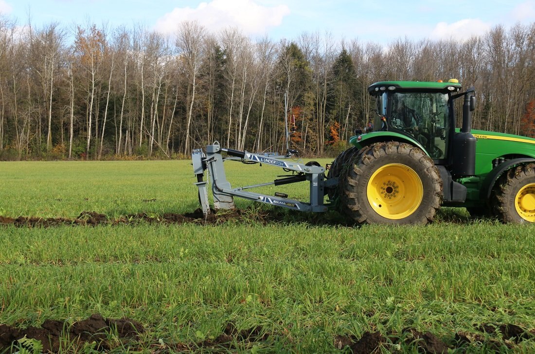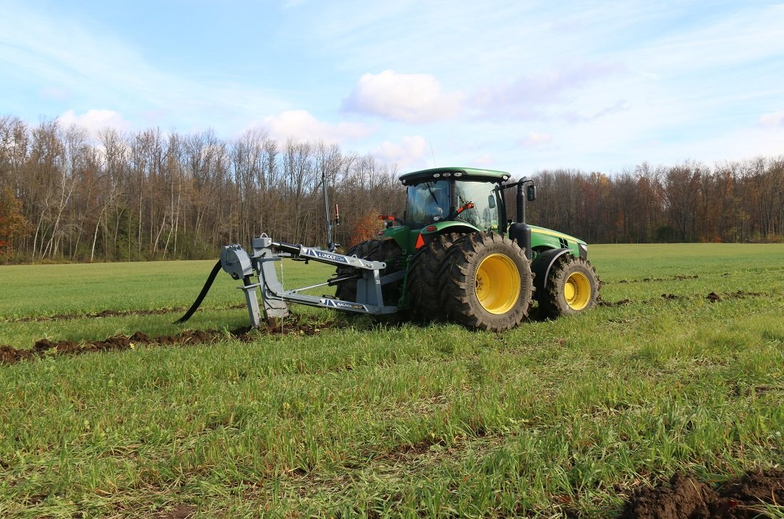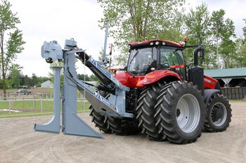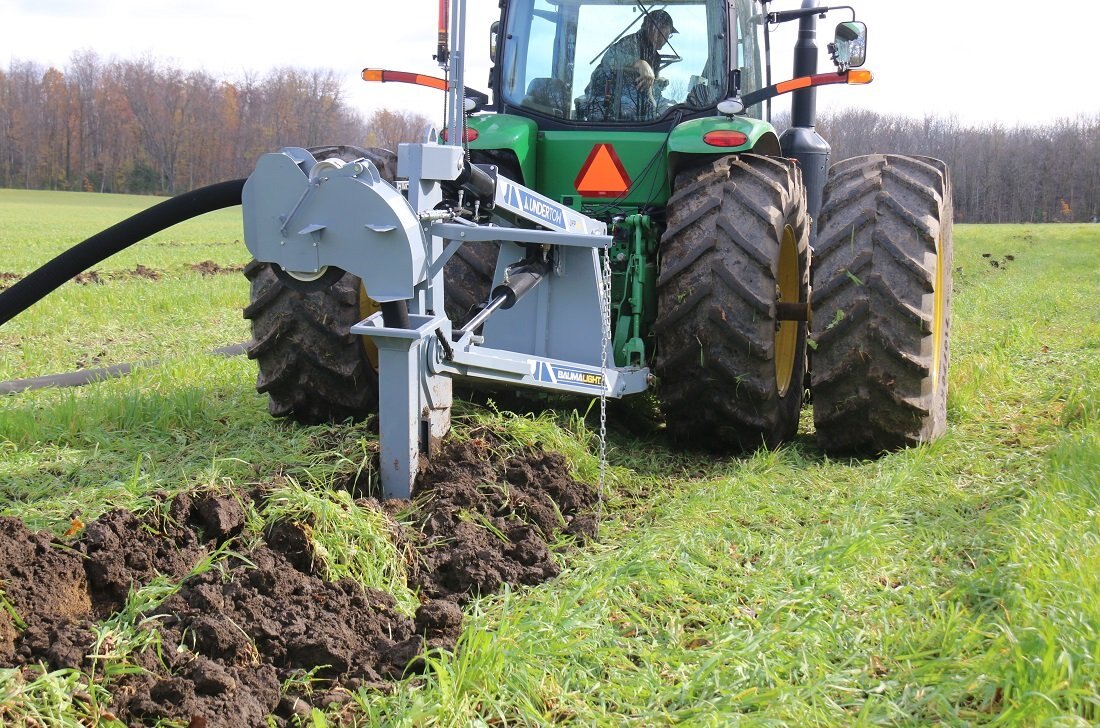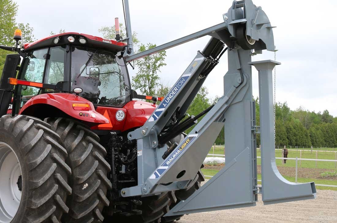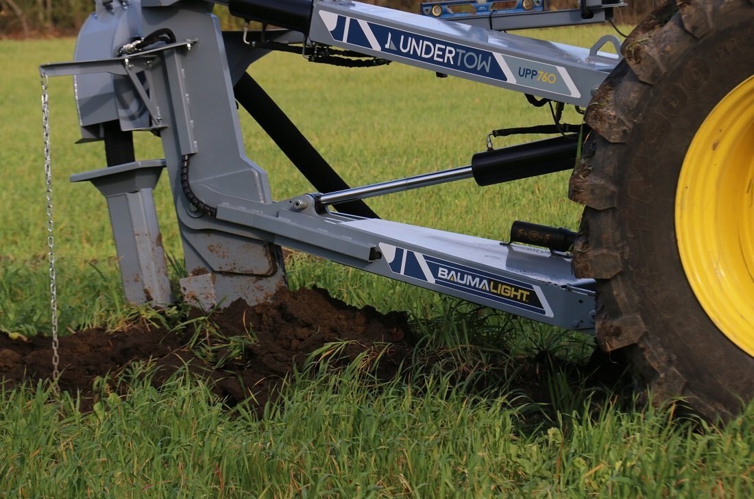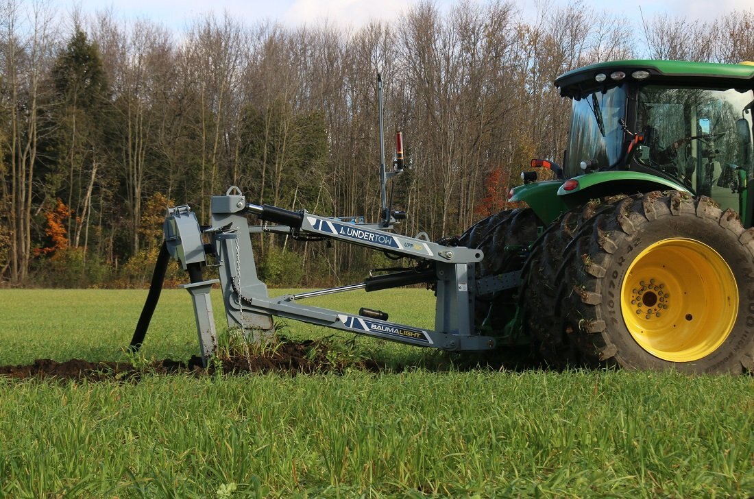 The UPP760 3-Point Hitch model offers the option of using a large tractor to lay drainage tiles up to 5 ft deep. The double linkage will help keep pressure on your front wheels as the top link pushes back on the shank. There is a manual override on the mast to offset the laser beam if needed and in cab digital controlling to make sure all your tiles are angled down. Includes a 4” & 6” boot and laser controls.