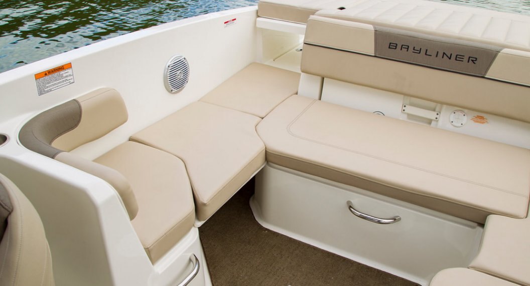 1. Available Water Sports Options let you customize the VR6 to suit your family's needs. 2. BeamForward™ design with high gunnels creates more passenger space, under-seat storage and safety 3. Enclosed changing room with optional port potty provides convenience normally found on larger boats 4. Exceptionally roomy cockpit thanks to our exclusive AftAdvantage™ design 5. Spacious cockpit seating converts to inviting U-lounge with addition of optional filler cushion 6. Standard integrated swim platform and optional platform extension are positioned further aft than comparable models adding interior space while providing the ideal staging area for water sports.