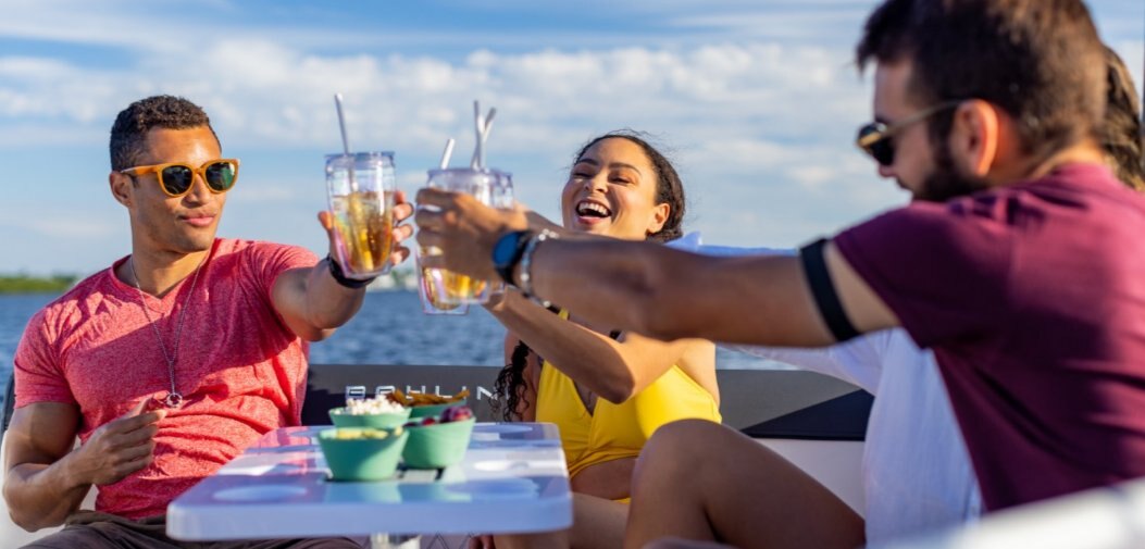 1. Dedicated wet bar with freshwater sink, prep area and grocery locker 2. Enclosed storage compartment with optional head 3. Transitional companion seat and sunpad for lounging options 4. Self-bailing cockpit