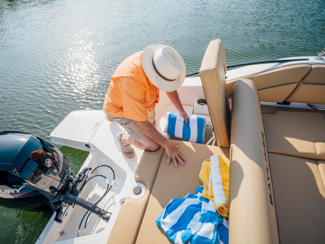 1. Dedicated wet bar with freshwater sink, prep area and grocery locker 2. Enclosed storage compartment with optional head 3. Transitional companion seat and sunpad for lounging options 4. Self-bailing cockpit