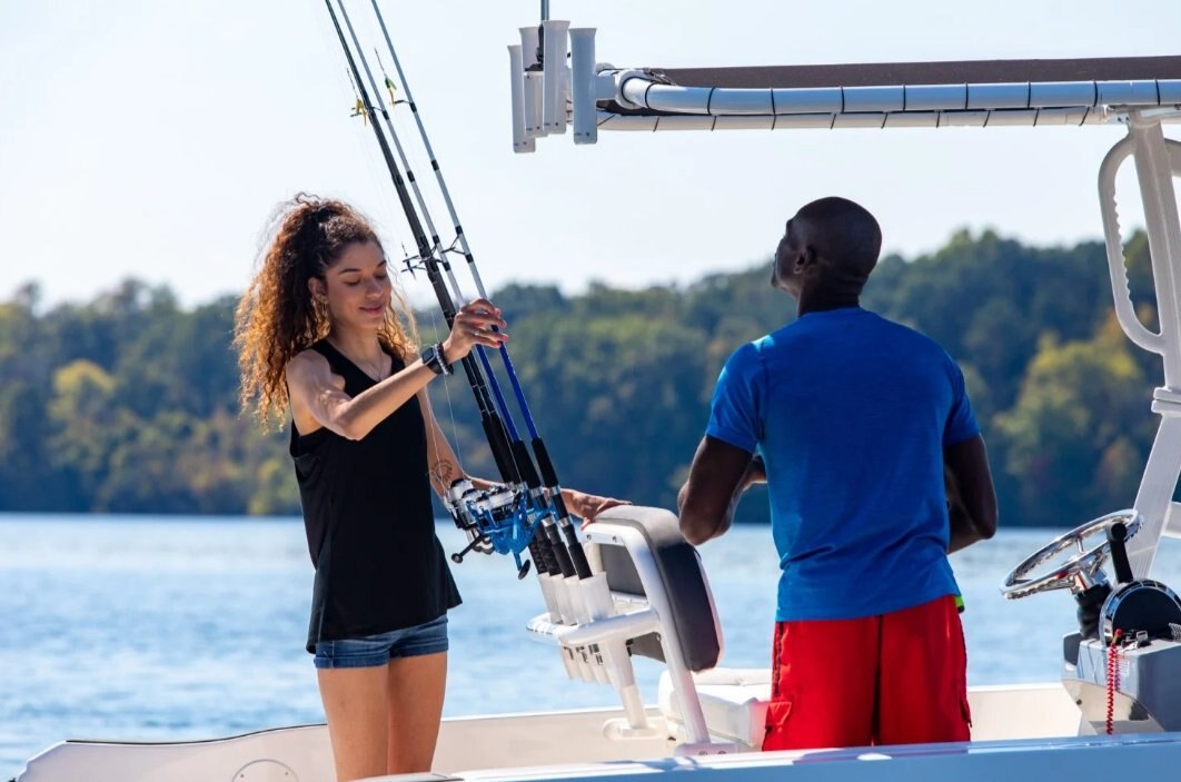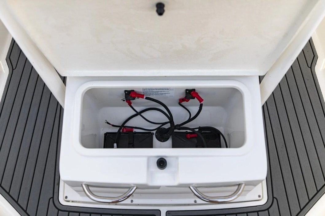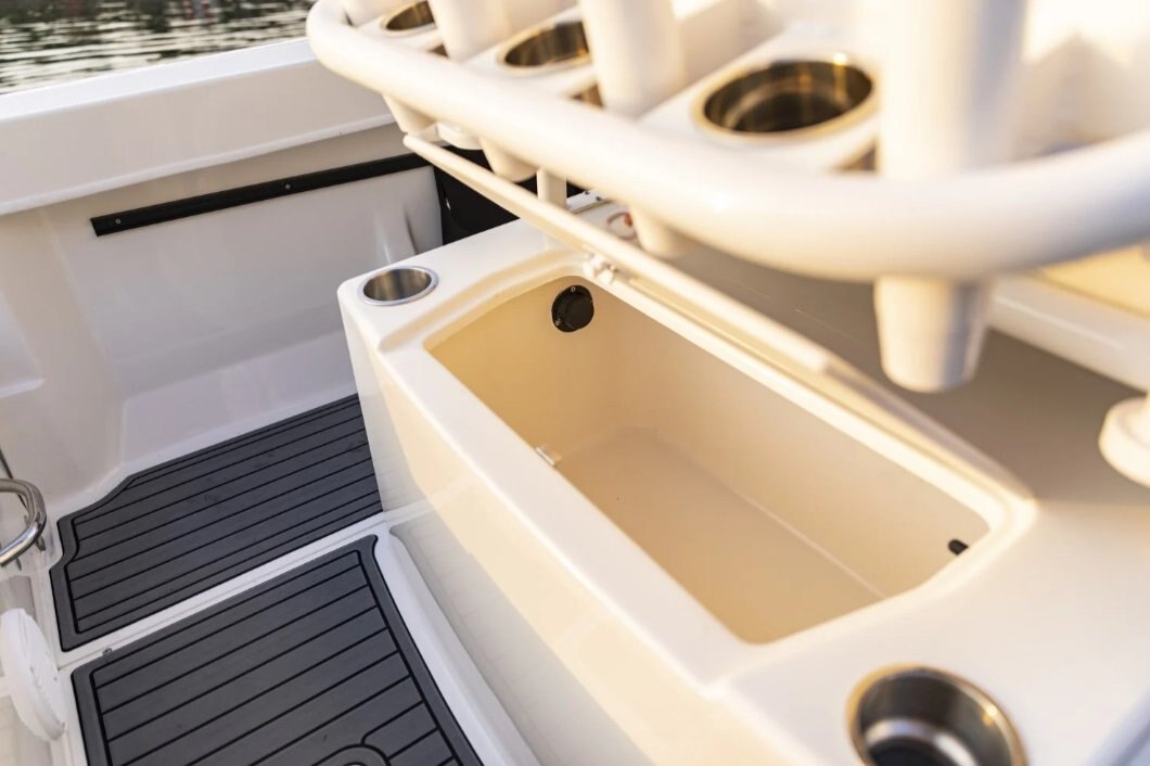KEY FEATURES12V Navigation Lights 9 Cupholders Anchor Locker Bow & Transom Eyes (3) Fiberglass Floor Liner Gunwale Rod Storage Helm Windscreen Port and Starboard Swim Boards w/ Ladder Reliable Mercury outboard power up to 300-HP, and sure, predictable handling Self-bailing cockpit keeps cockpit dry and makes cleanup easier Spacious layout with fore and aft casting decks, ample storage and all the fishing features you need |