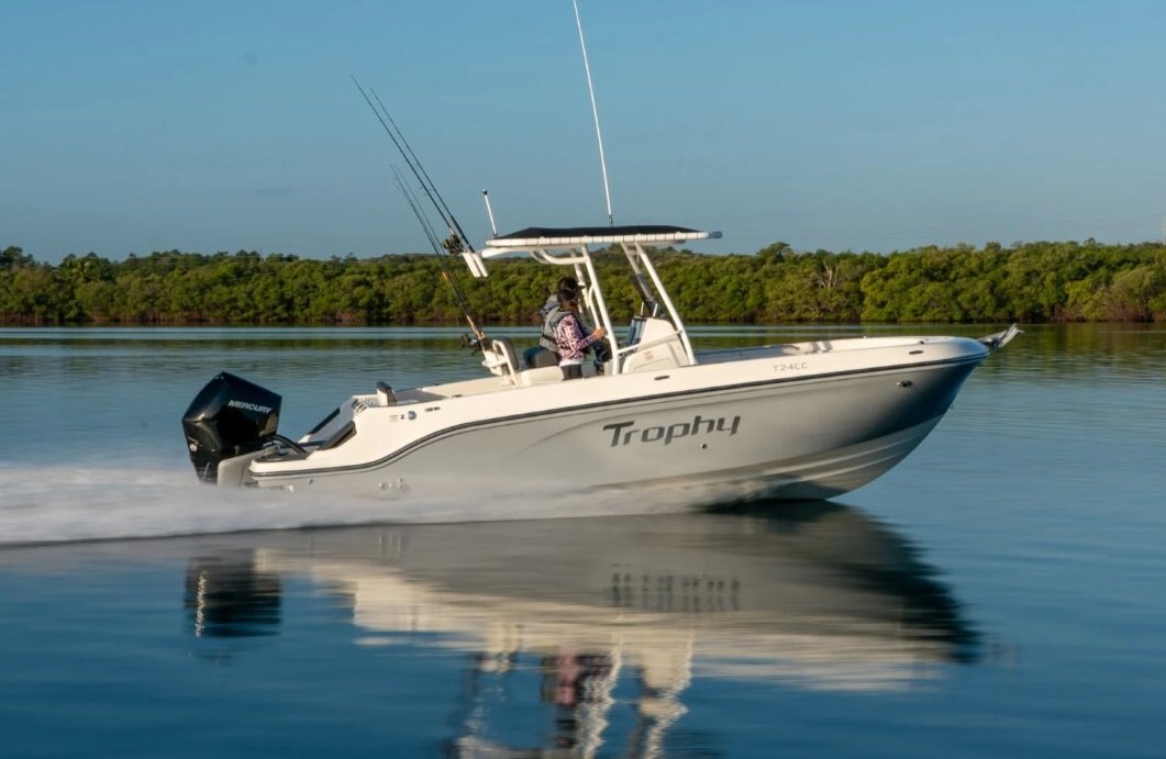The newest addition to the Trophy series innovation expands our center console capabilities with increased fuel capacity, rugged fishability, increased storage and amplified cruising comfort adding up to incredible value. Built on a deep V-hull foundation, the T24CC accommodates up to 12 people on board, making this the perfect family fishing boat for inshore and coastal angling as well as entertaining. Discover the same user-friendliness and convenience features found in other Bayliner models in addition to new options designed to give you greater confidence in all your pursuits. 1. Self-bailing cockpit |