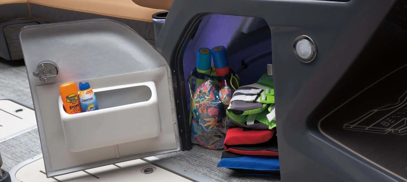 Experience effortless organization aboard the M Line. Designed with convenience in mind, it features dedicated spaces for essentials items—such as towels, coolers, bags and more.