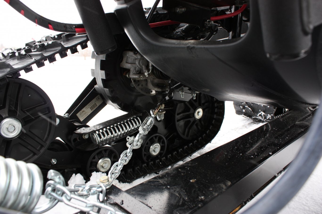 Chains with straps or brackets (brackets stay on permanently) attach to the front axles.