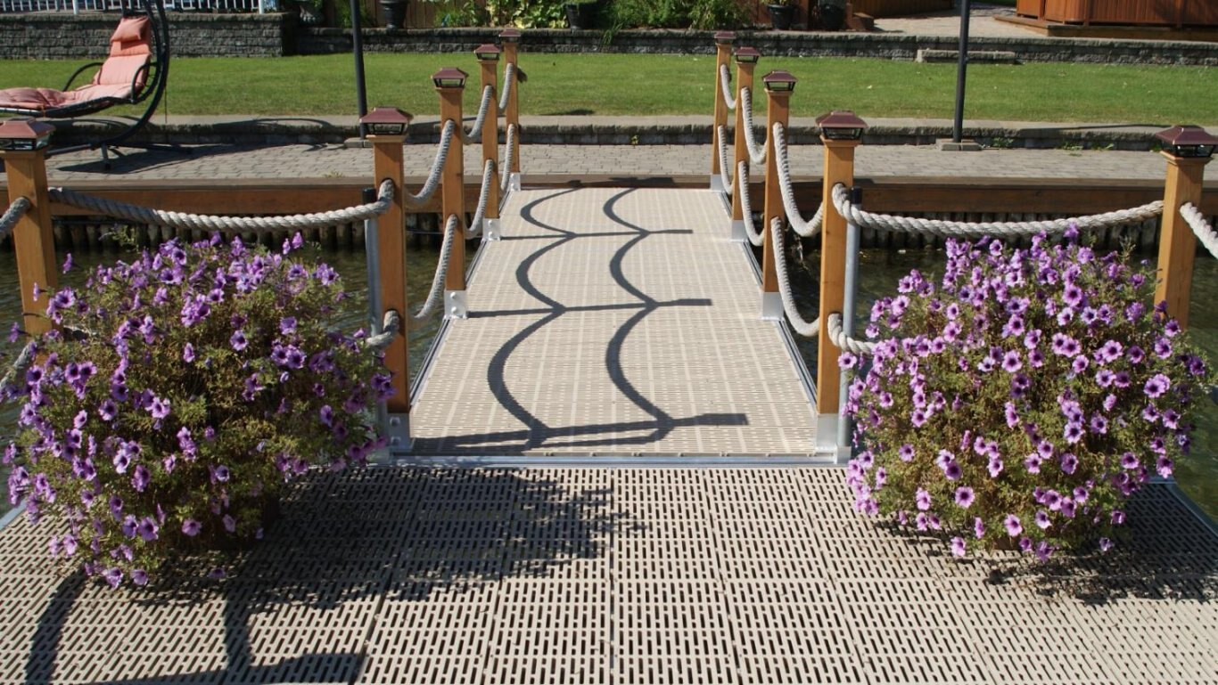 Long life and little maintenance Our docks on posts, with the non-slip Thruflow plastic decking, are light weight and have a very long life with little to no maintenance. Thruflow is available in beige or grey. |