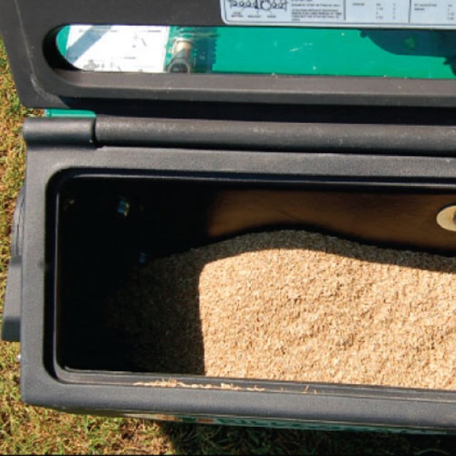 The 25-lb capacity front mounted poly seed box won’t rust or dent. On board instructions are conveniently mounted under the lid to help set seed drop rates.