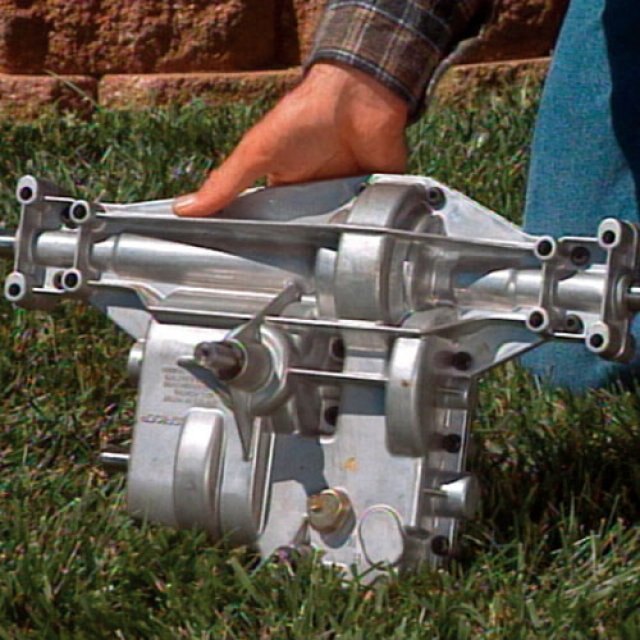 Combines the transmission and differential into one sealed package with no linkages to snag on brush. Maintains positive traction on both 16” puncture proof tires. Three speeds and reverse.