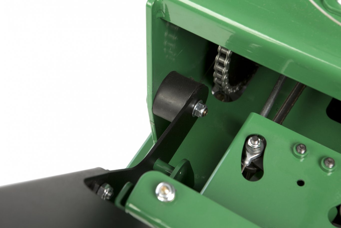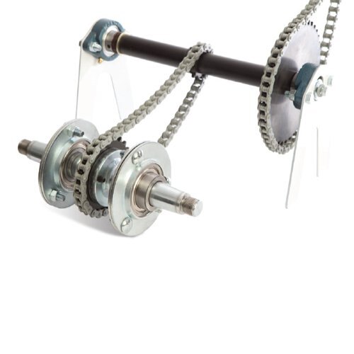 HEAVY-DUTY TRANSMISSION Drives 1.25” plated tapered axle with two-inch sealed bearings coupled to a one-inch jack shaft with armor coated chain for rugged drive reliability. |