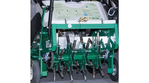 For larger property aeration, the tow behind AET48 is the ultimate in productivity and flexibility. The standard 48” modular unit easily configures down to 24” and features interchangeable parts. Each 24” unit has four tine stars with six tines each that core up to 3” deep. The unit can be configured up to 72” wide with the optional AET expansion kit (Part No. 361273). Optional water weight jugs eliminate bulky steel weights, and are positioned directly over the tines for better aeration depth.