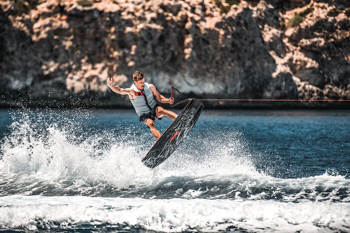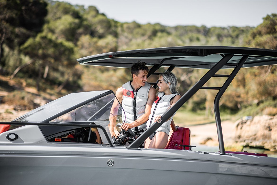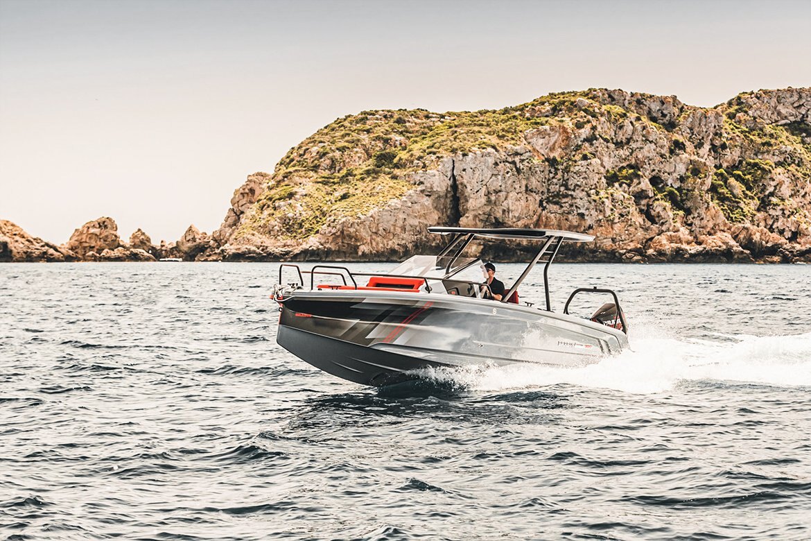Designed for water sports enthusiasts, the agile sportster features a water-ski pole in an immaculate matte black finish for water-skiing, inflatable towing and wakeboarding as well as a swim ladder for easy access to the boat from the water. The multi storage aft layout option is perfect for owners with a large collection of water toys and gear, from snorkeling fins to SUP boards. Those who are rather looking for more socializing space will also find a right match: The U-sofa aft layout option includes a table and cushions. Drivers choosing this option can cap their days off by enjoying sunset drinks and alfresco meals with their friends.